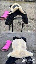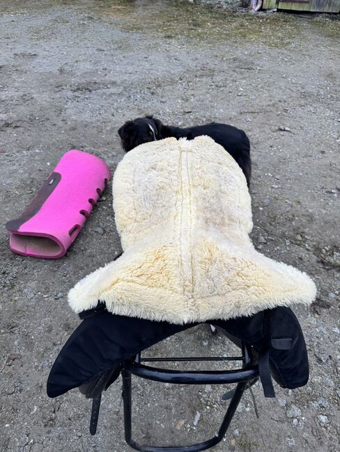 Podkładka pod siodło ze skóry jagnięcej - Sprzedaję używaną podkładkę ze skóry jagnięcej od HKM, podkładka jest w bardzo dobrym stanie.... tylko lekko odbarwiona od wewnątrz (patrz zdjęcia)... Miałem ją pod siodłem 17,5 cala. Nie ma gwarancji ani zwrotu... koszty wysyłki pokrywa kupujący.