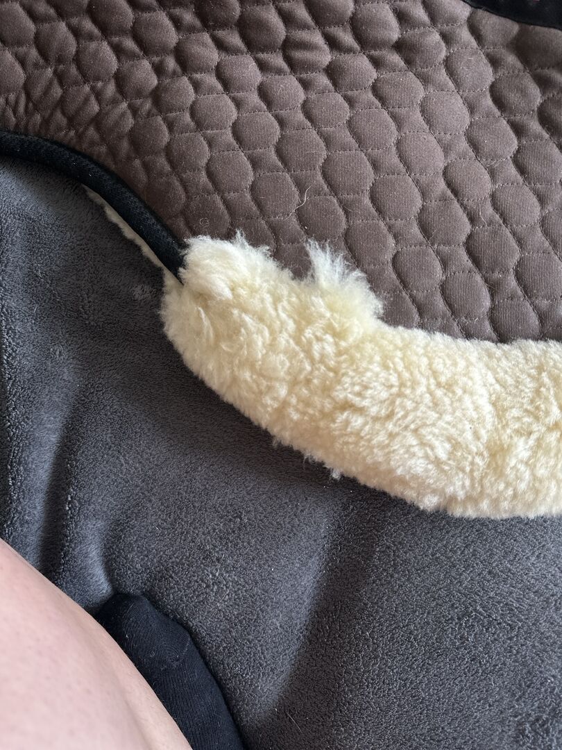 Podkładka ze skóry jagnięcej Christ / Podkładka pod siodło WB - Zawsze leżał między siodłem a podkładką pod siodło, sierść nadal bardzo gęsta w okolicy siodła. Krawędź sierści wykazuje typowe ślady użytkowania (sierść odpada w miejscach, w których ciągnie się ją do kształtu, patrz zdjęcia). Sprzedajemy tylko dlatego, że jest za duży na nasze nowe siodło.