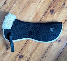 Podkładka pod siodło "Standard" firmy Christ zachwyca pięknym wyglądem i wieloma przydatnymi funkcjami. Tylna linia jest dostosowana do grzbietu konia, dzięki czemu idealnie pasuje i jest wygodna w noszeniu. Materiał to prawdziwa skóra jagnięca od spodu, która ma przybliżoną wysokość 30 mm i jest podciągnięta do góry z przodu, aby służyć jako podkładka pod siodło. Wierzch składa się z kilku elementów specjalnego materiału siodłowego, które są ze sobą pikowane. Tkanina ta nie tylko wygląda elegancko, ale jest również wytrzymała i solidna, dzięki czemu podkładka pod siodło ma długą żywotność. Podkładka pod siodło jest mocowana do pasków popręgu siodła za pomocą pasków na rzepy, jest łatwa i niezwykle szybka.