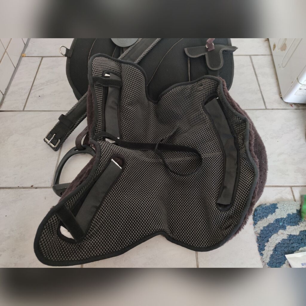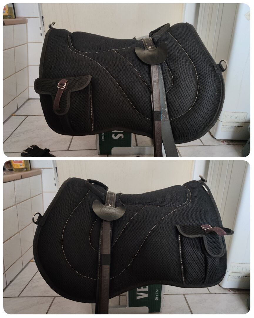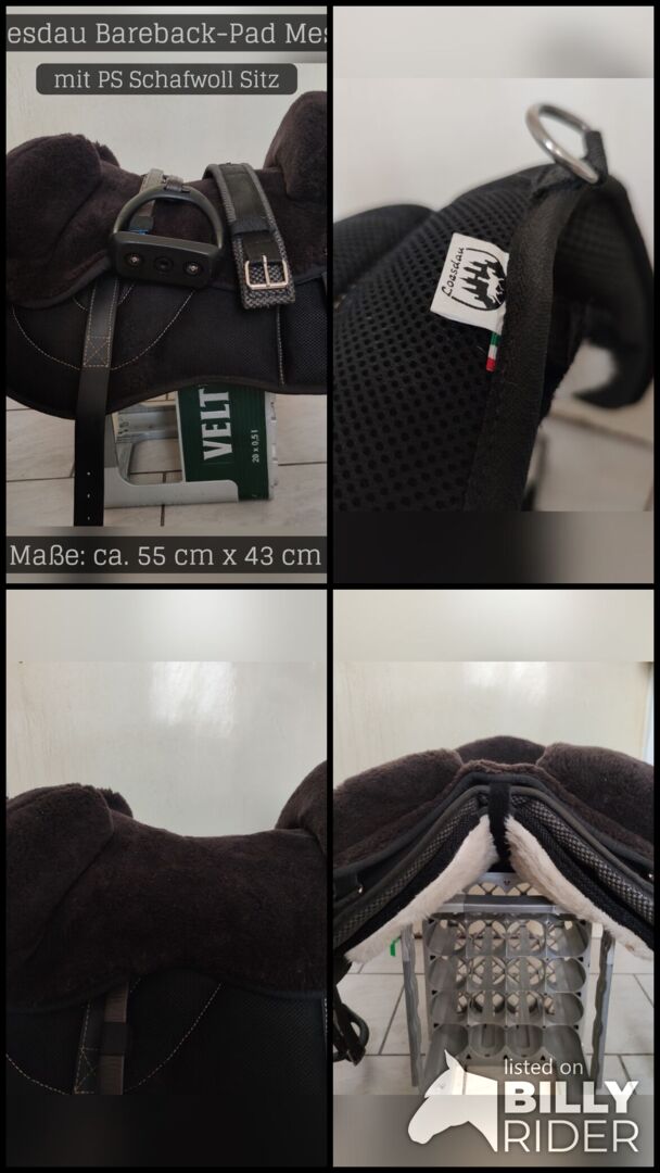 Poduszka do jazdy z opadającym siedziskiem - Sprzedam Loesdau Bareback-Pad Mesh w kolorze czarnym 55cm x 43cm, anatomicznie ukształtowany, antypoślizgowy, oddychający, z nowym siedziskiem z owczej skóry w kolorze brązowym, jak również obręcz strzemion w kolorze brązowym lub czarnym do wyboru.