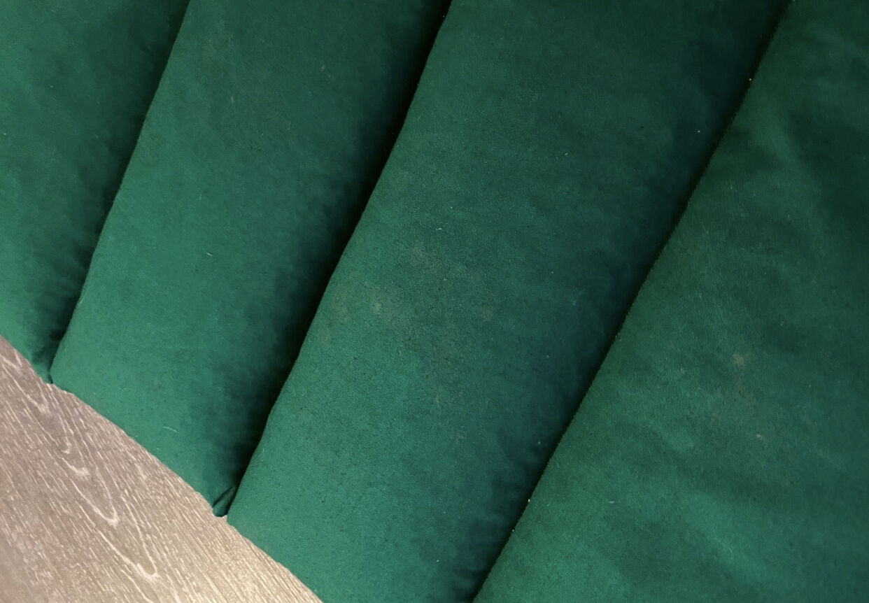 Poduszka z łusek orkiszowych - Sprzedaję własnoręcznie uszytą poduszkę z futra orkiszowego na grzbiety koni. Niestety mój koń jej nie lubi... Poduszki użyłam tylko dwa razy i też jest miła i ciepła na grzbiecie. Był zawsze przechowywany w suchym miejscu i używany tylko z cienkim kocem między koniem a poduszką. Niemniej jednak niestety doznała kilku śladów przechowywania, które widoczne są w postaci lekkich i niewielkich plam na tkaninie. Nie przeszkadzają one jednak w pełnieniu funkcji i są jedynie skazą. Próbowałem je sfotografować. Poduszka ma 5 komór, a tkanina to zielona bawełna. Poduszka wypełniona jest również 2,6 kg łuski orkiszowej.