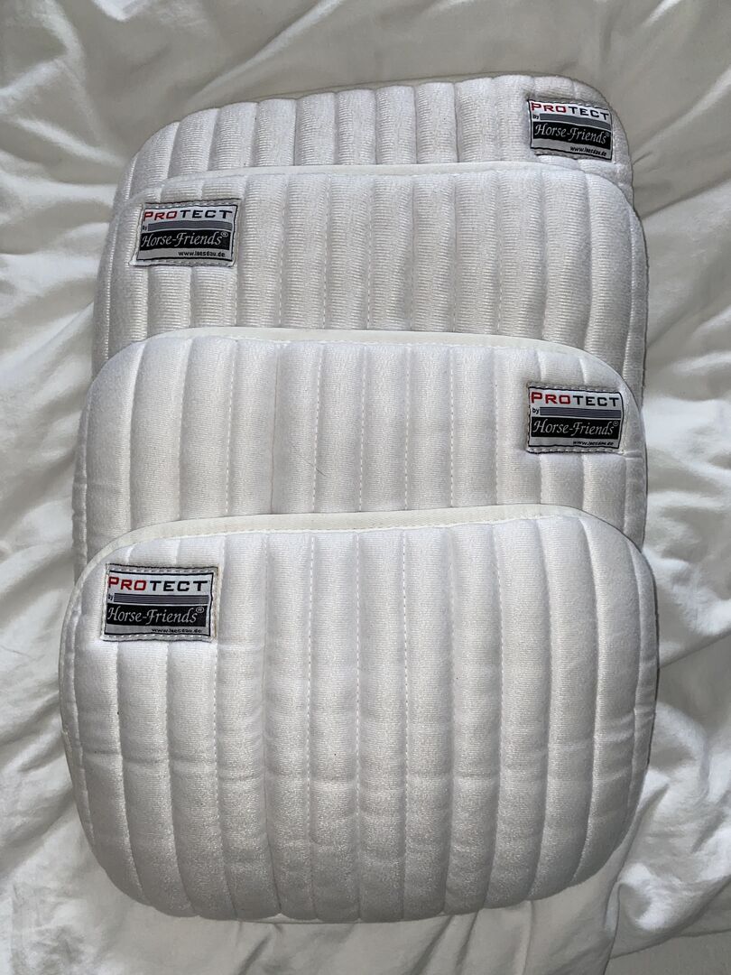 Poduszki do bandażowania - 4 białe podkładki pod bandaże w bardzo dobrym stanie. Sama kupiłam używane ochraniacze, ale niestety są one za małe na mojego konia. Wymiary: 35 cm x 25 cm. Na zewnątrz i wewnątrz nie ma włosów.