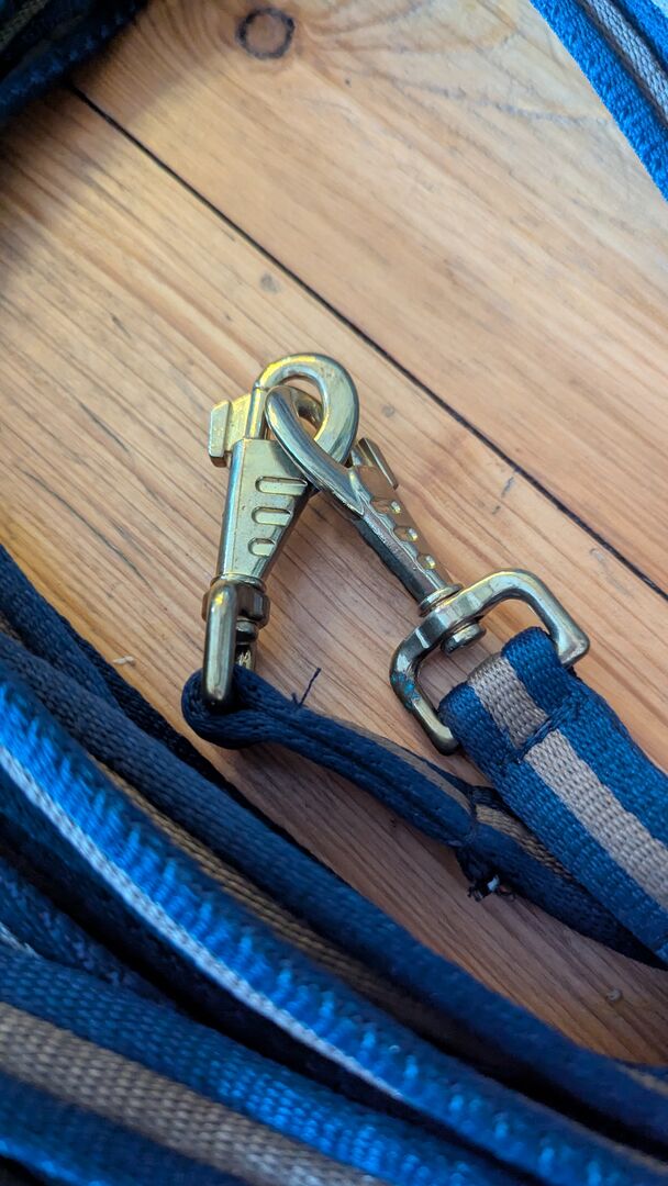 Podwójna lonża ciemnoniebiesko-brązowa (zamknięta) z normalnymi karabinkami w kolorze złotym. 17m. Mało używana. - Zobacz tytuł. Prawie nigdy nie używałem tego podwójnego lonży.