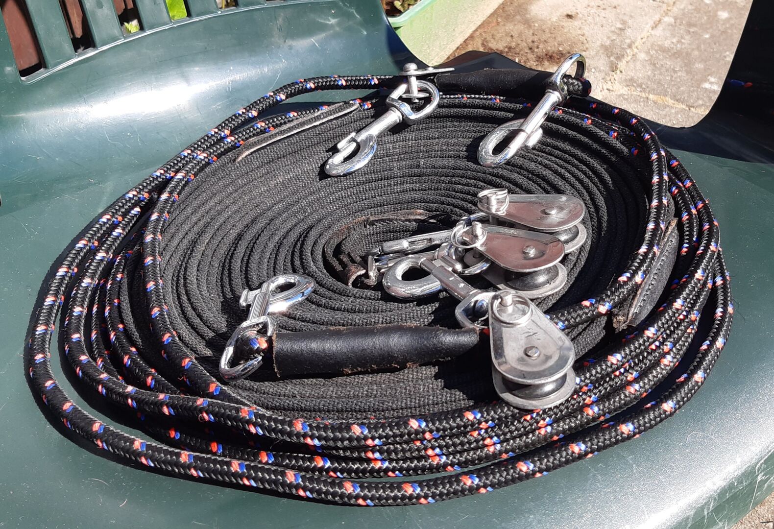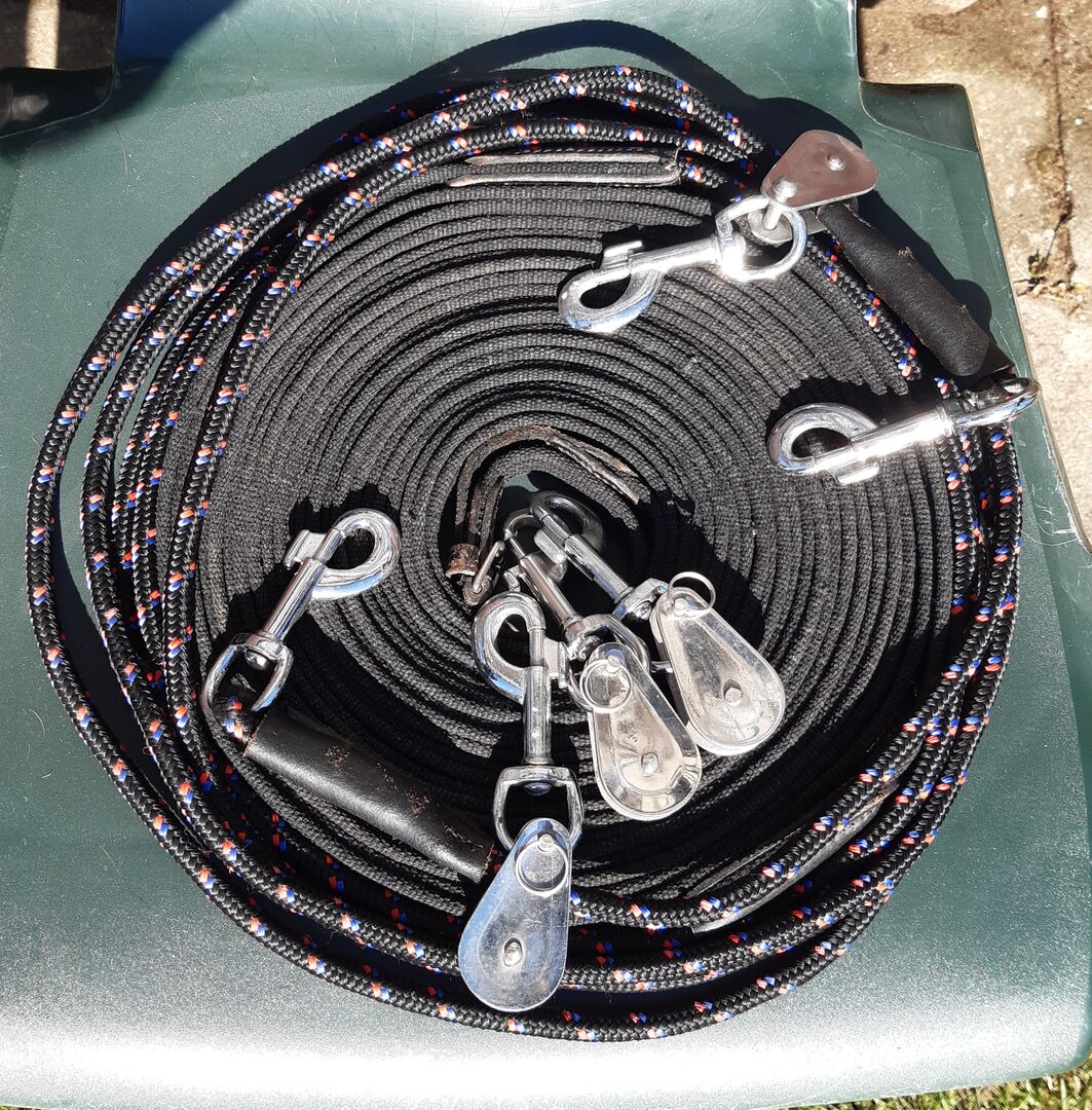 Podwójna lonża z 4 odłączanymi krążkami, ok. 18 m, z możliwością podziału - Dobry stan z niewielkimi śladami zużycia.