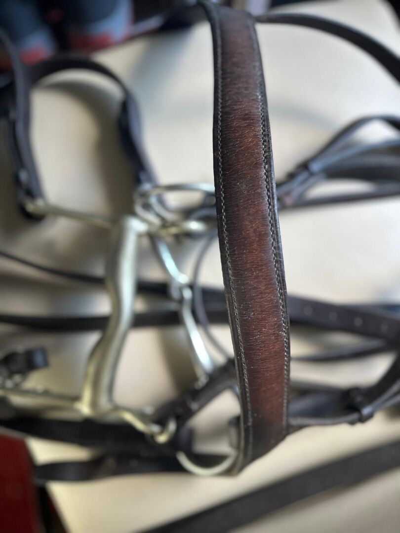 Podwójna uzda z gryzakiem Argentan - Na sprzedaż podwójna uzda z argentyńskim krawężnikiem i uzdą. Krawężnik wewnątrz 12,5 cm, uzda wewnątrz 14,5 cm. Pasek nosowy ma ślady zużycia, ale cała uzda jest wykonana z bardzo wytrzymałej skóry.