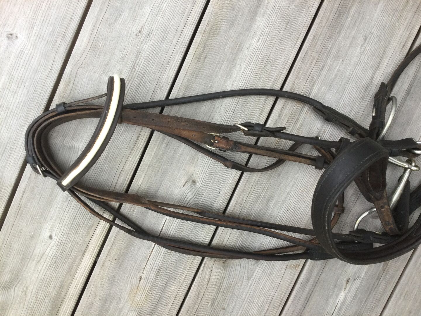 Podwójny kantar z gryzakiem i lejcami - Podwójna uzda z gryzakiem, łańcuszkiem i lejcami dla koni ciepłokrwistych Skóra z okrągłymi szwami brązowy Używane, stan ok, zbyt dobre by wyrzucić