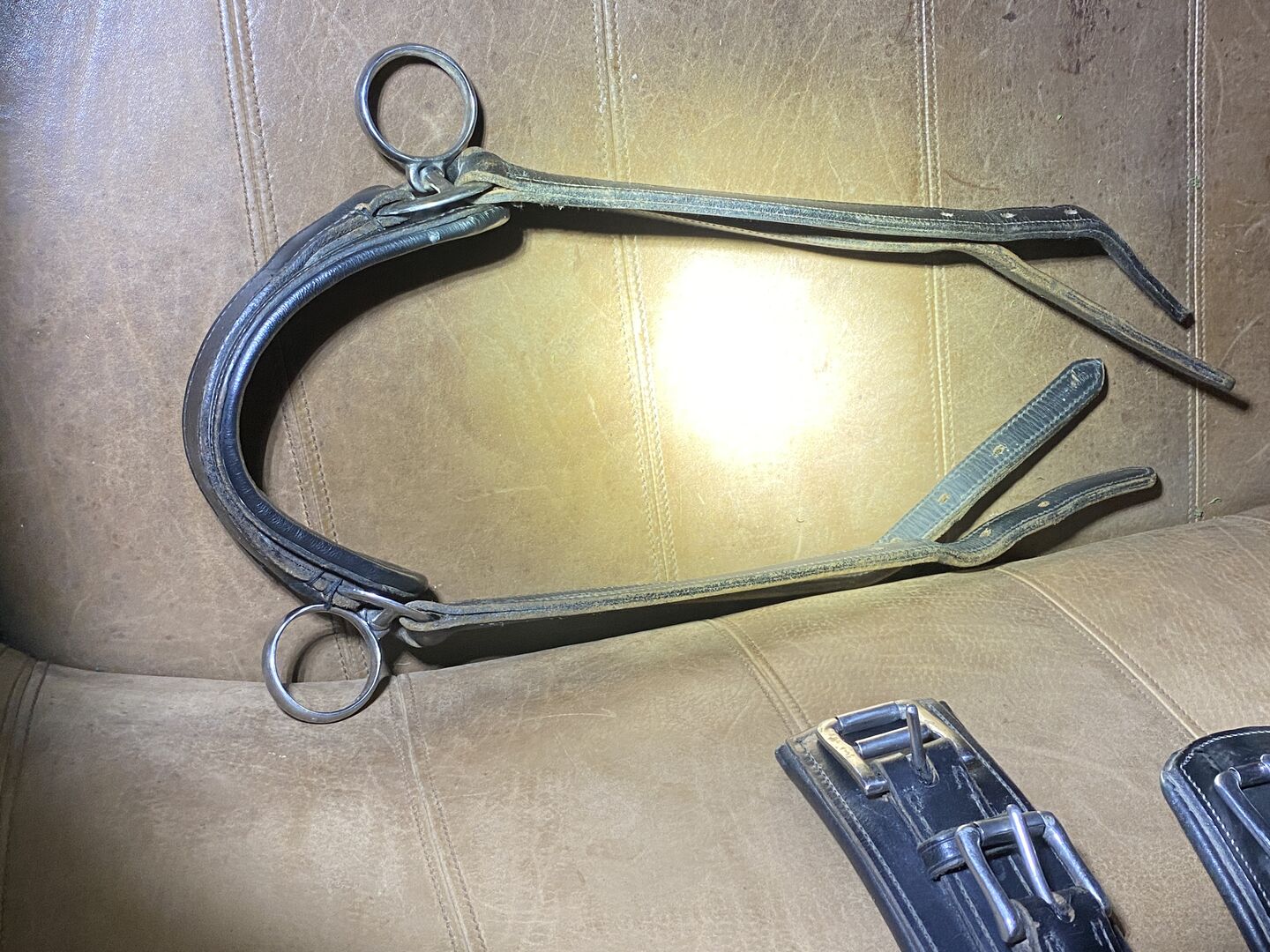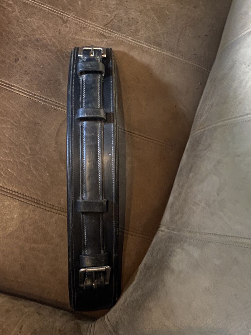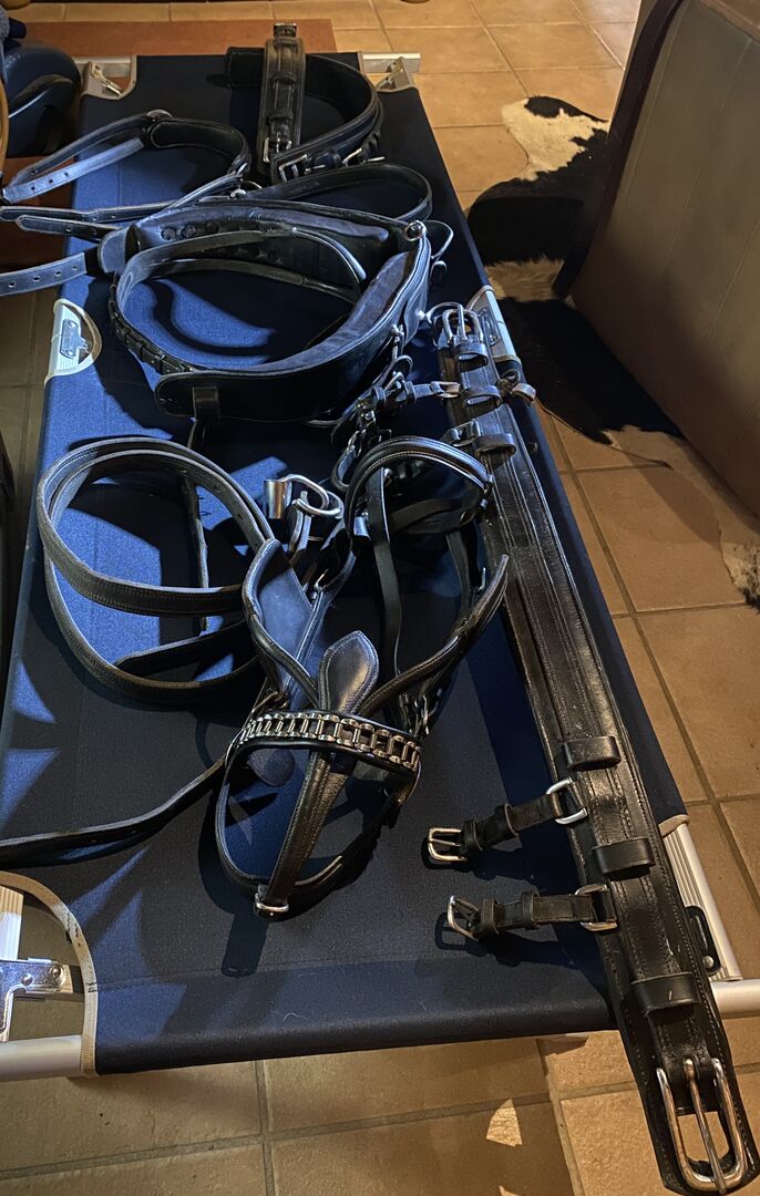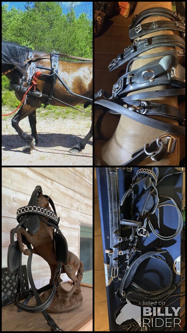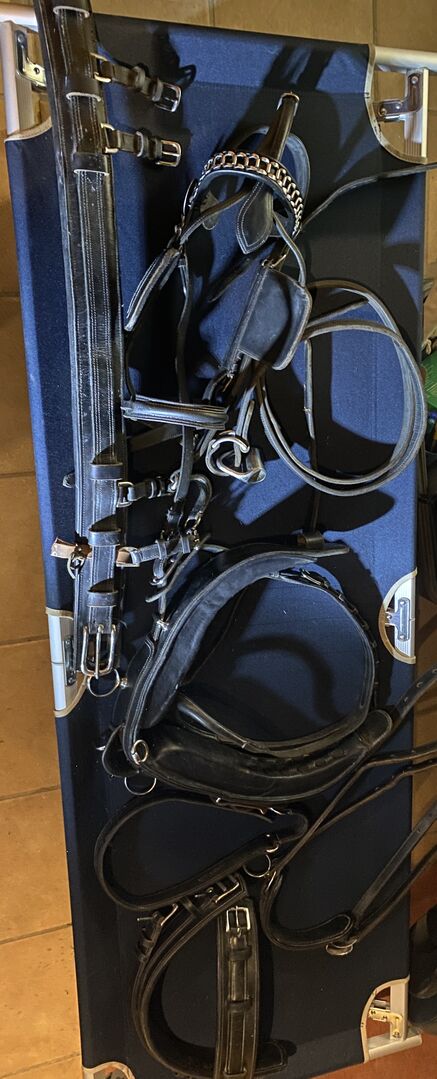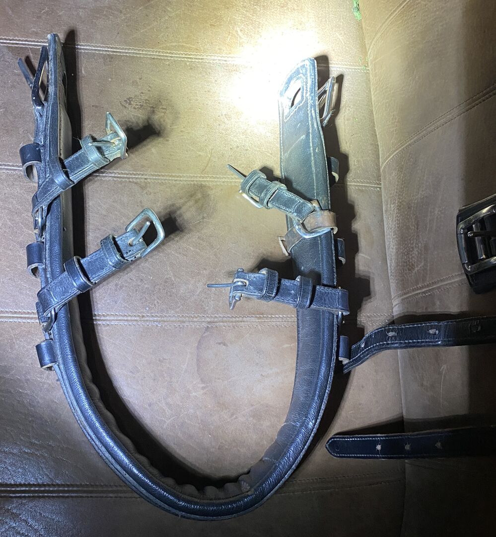 Pojedyncza uprząż - Na sprzedaż uprząż do jazdy konnej Bardzo dobra gruba skóra kolor czarny W jednym miejscu nieco uszkodzony patrz zdjęcie, poza tym w świetnym stanie Możliwa wysyłka z Niemiec