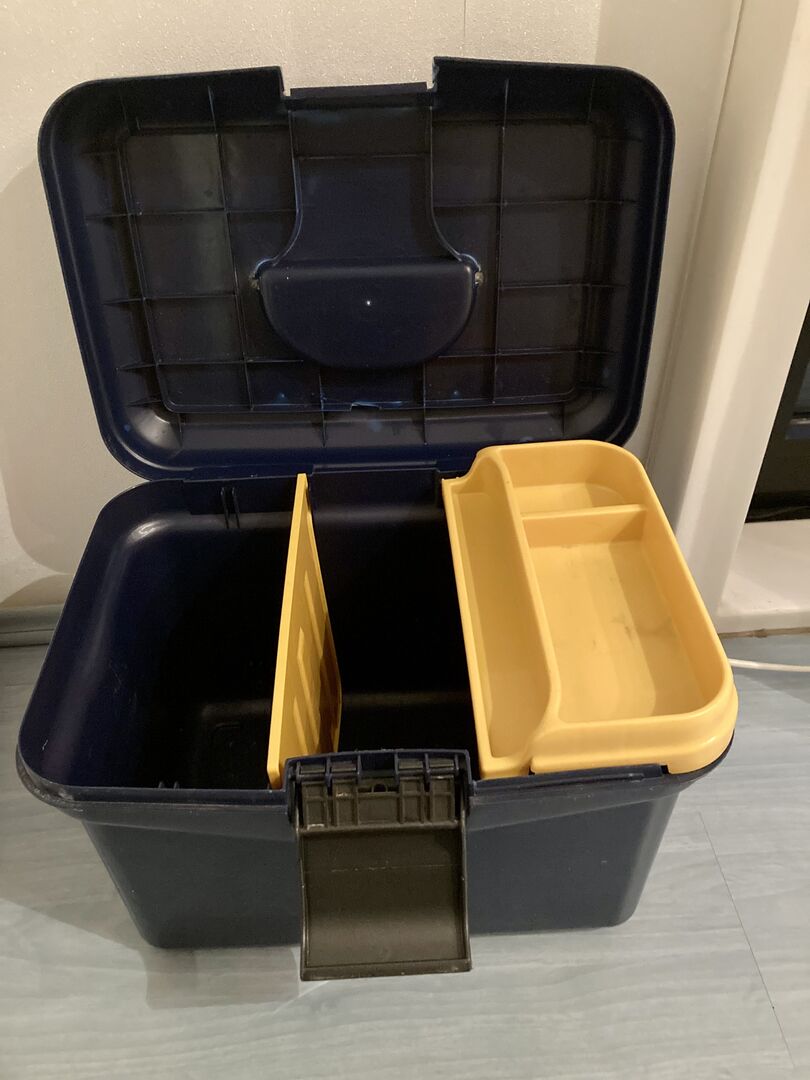 Pojemnik na środki czyszczące ciemnoniebieski - W ofercie znajduje się super praktyczna, duża walizka do pielęgnacji. Lewą przegrodę można regulować na dwa sposoby. Futerał jest w pełni sprawny i nienaruszony, widać na nim jedynie normalne ślady użytkowania.