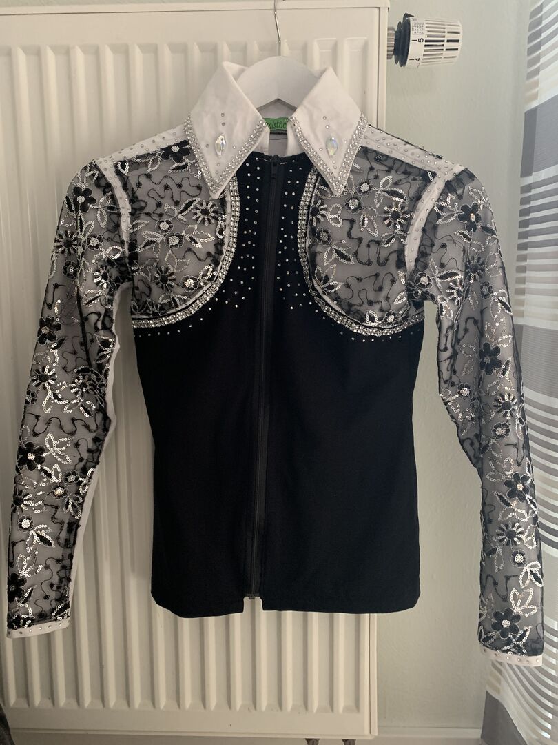 Pokaż bluzkę na sprzedaż - Bluzka w rozmiarze XS do sprzedania z dużą ilością brokatu i detali, specjalnie wykonana z jednego kawałka. Świeżo wyczyszczone, stan bardzo dobry