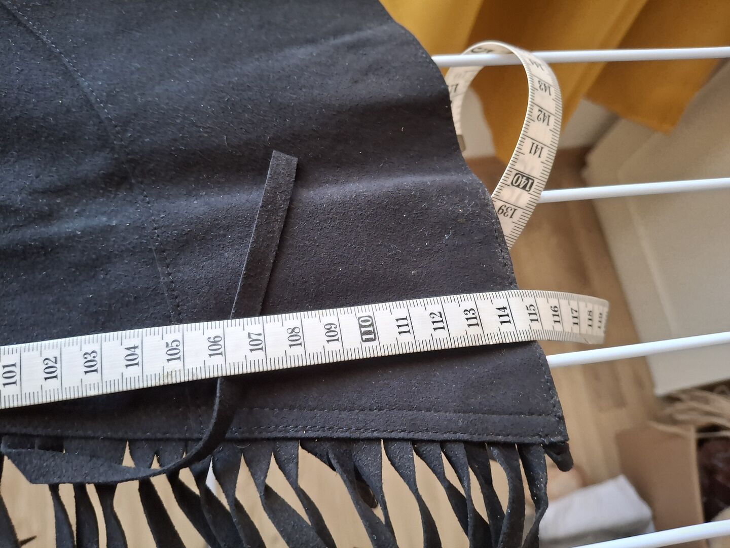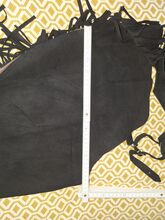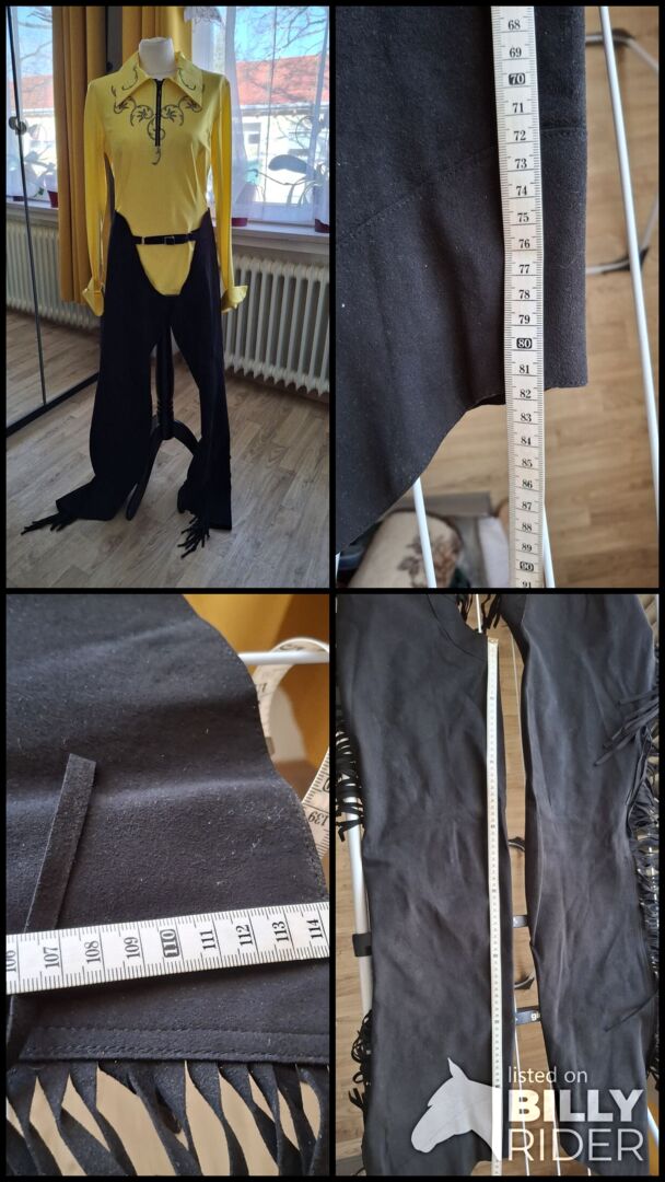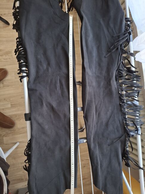 Pokaż czapki - Piękne proste czapsy, do rekreacji lub pokazu, czarny delikatny zamsz? Frędzle z boku. Minimalny rozmiar w pasie 50 cm, maksymalny 55 cm, wewnętrzna długość nogawki 80 cm, zewnętrzna długość nogawki 98 cm. Stójka z tyłu.