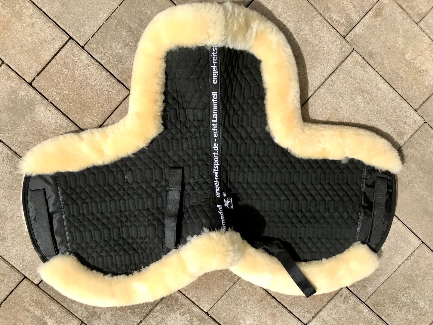 Pokrowiec na siodło ze skóry jagnięcej - NOWOŚĆ - - Wysokiej jakości materiał na siodło wykonany z bawełny i 100% skóry jagnięcej z australijskich merynosów. Cały spód i klapa siodła wykonane ze skóry jagnięcej. Delikatne dla konia i jeźdźca. Popręg zapinany na rzep i szlufki. Kolor materiału: czarny Kolor skóry jagnięcej: średni/naturalny Rozmiar VSS.