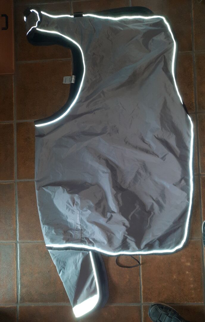 Pokrowiec przeciwdeszczowy - Kolor beżowy, obramowanie brązowe, odblaskowe szwy i końcówka ogona. Wewnętrzna podszewka polarowa. Producent nieznany, rozmiar (według metki) 125 cm