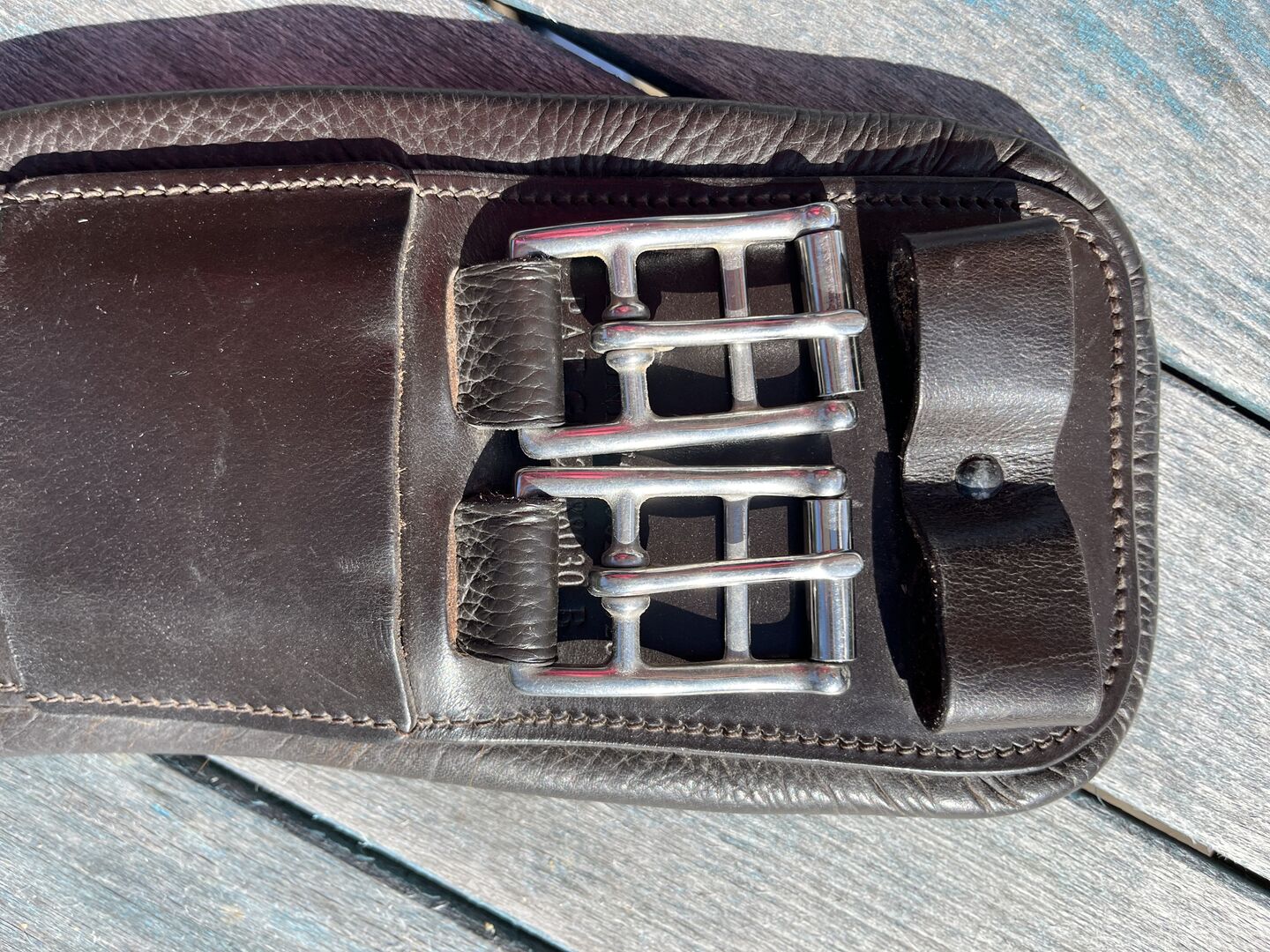 Popręg ujeżdżeniowy FAIRFAX, ciemnobrązowa skóra, 65 cm - Krótki popręg Fairfax w bardzo dobrym stanie, wykonany z miękkiej skóry z szeroką powierzchnią styku i optymalnym rozkładem nacisku: