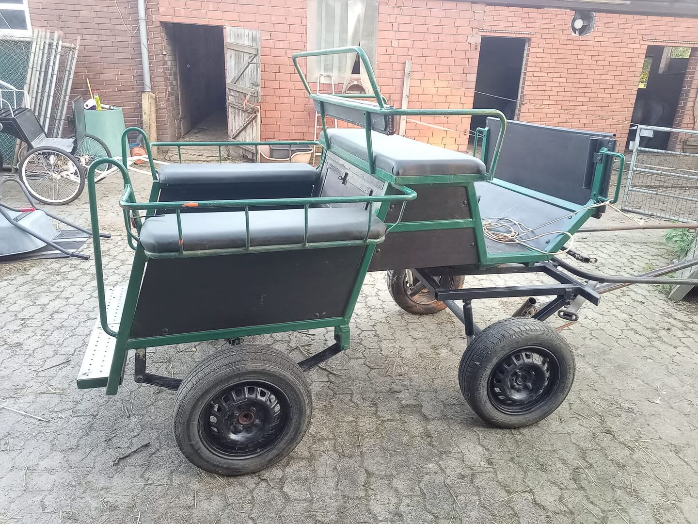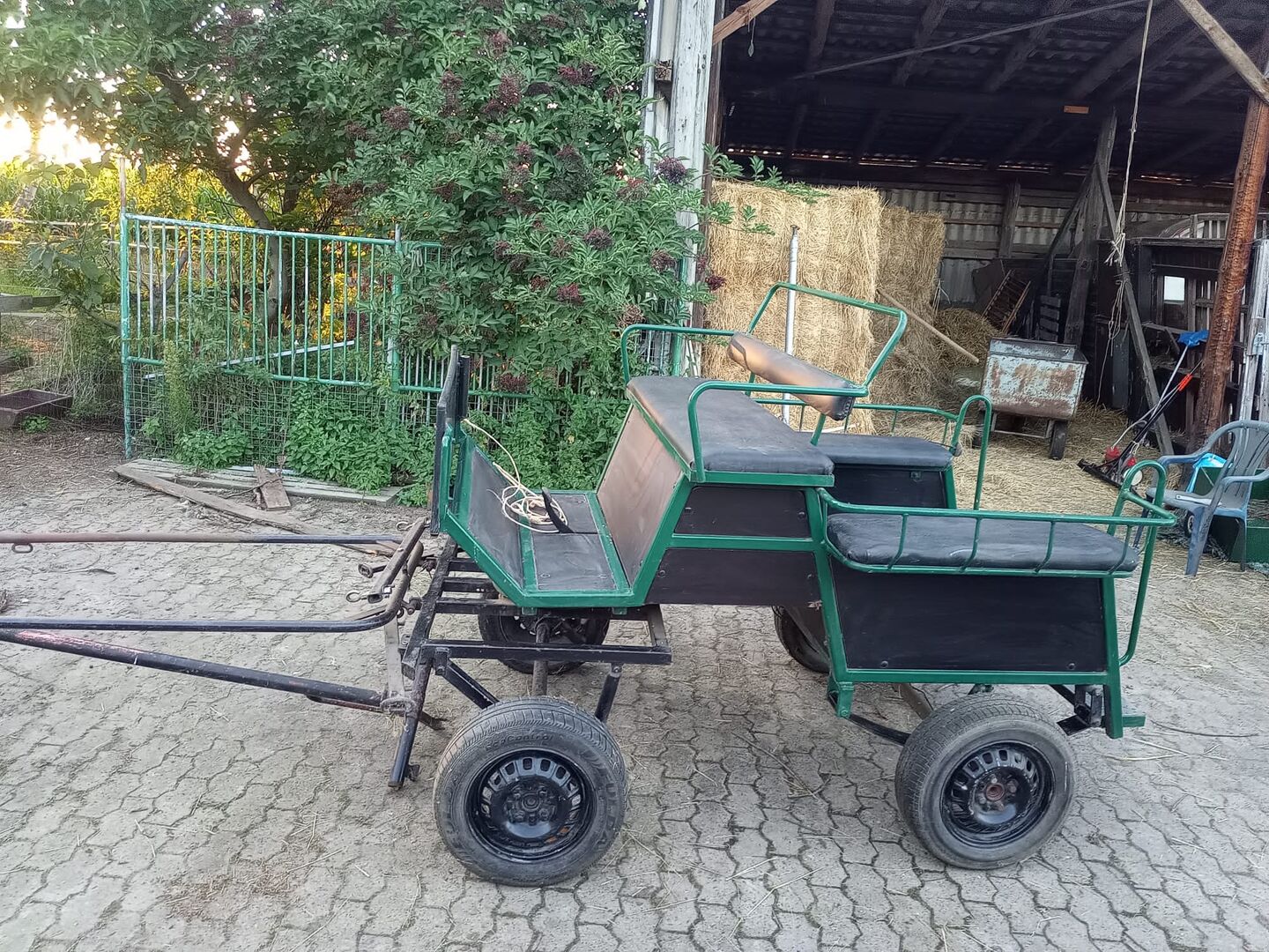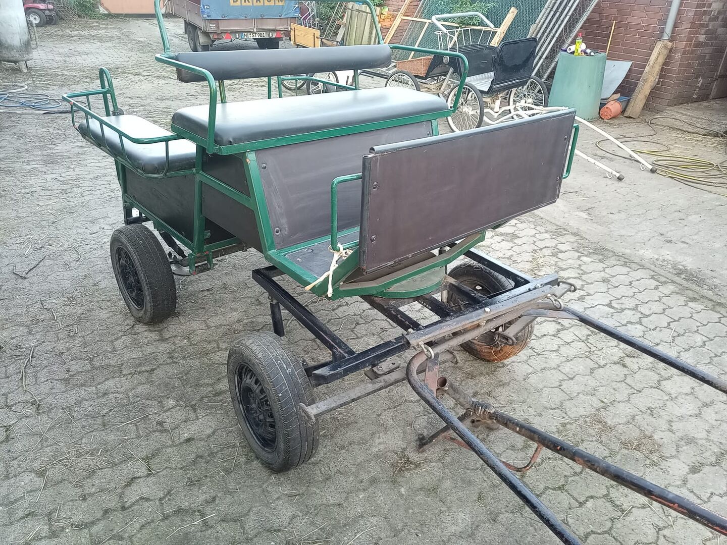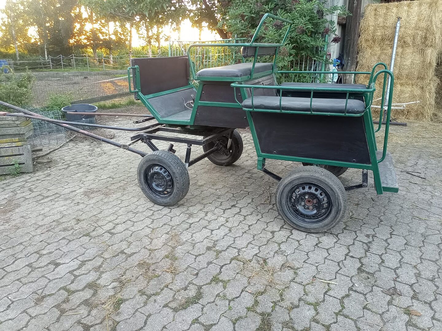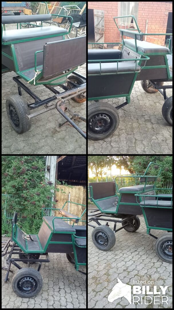 Powóz - gotowy do powożenia 1 i 2 końmi - Przedstawiony powóz z drzewem i widłami jest na sprzedaż. Nadaje się dla większych kuców (Haflinger, Tinker, koń fiordzki, kuc jeździecki, walijski C itp.) Powóz posiada hamulec nożny i schowek. Drzewo można regulować, aby było swobodnie zawieszone.