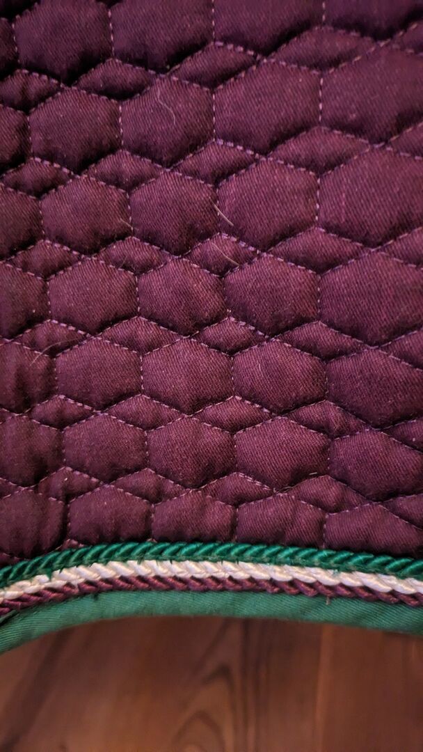 A purple dressage saddle pad with green merino wool from premier Equine. Has been washed and is in excellent condition, may have a few grey hairs, but everything else is in excellent condition. Comes with a purple Shires hat silk which is new.