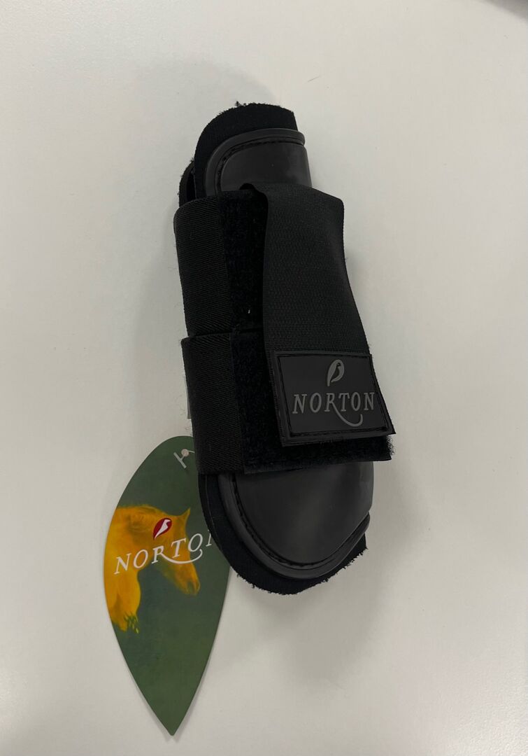 Przednie getry - Buty jeździeckie w kolorze czarnym, z praktycznym zapięciem na rzep i miękkim neoprenem wewnątrz. Zewnętrzna osłona wykonana jest z twardego plastiku.