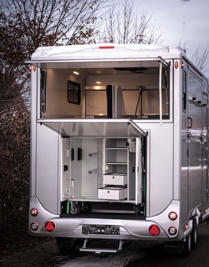 Są one wyposażone w przedział mieszkalny lub przestronne pomieszczenie socjalne i zapewniają duży komfort podczas pokazów lub podróży. Nasza przyczepa do transportu 2 koni dla klasy prawa jazdy 3 lub jako dodatkowa przyczepa do Dickenherr 2-Ride,