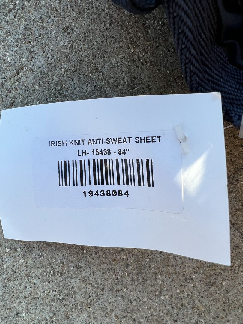New with tags 84 inch Irish knit anti sweat sheet. Quick-drying and can be used as an underlayer, trailering sheet, or in the stall. The two-buckle open front with hook and loop assist closure, smooth nylon lining at the shoulders to prevent rubbing and front surcingle are adjustable for a perfect fit. Fleece withers