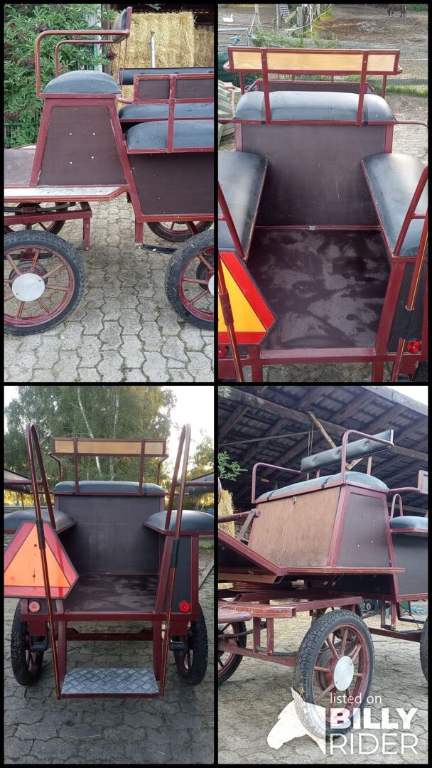 Drzewo można doposażyć, ale nie jest dołączone. Nadaje się dla większych kuców (np. Haflinger, Tinker, koń fiordzki, kuc jeździecki, Welsh C itp.) Powóz posiada hamulec nożny. Powóz został technicznie wyremontowany dwa lata temu, a następnie niestety nie był już prowadzony z powodu braku czasu i zmiany konia. Lokalizacja Remiese (sucha). Jest lekki i dobrze się toczy. Wymiary ok: Wysokość kozła 140 Szerokość 127 Długość 240 Długość wideł 205 Szerokość w najwęższym miejscu 81