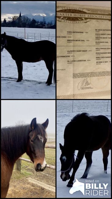 Przyciągający wzrok! Wyrazisty, piękny wałach rasy Quarterhorse - Na sprzedaż jest obiecujący wałach rasy American Quarter Horse, urodzony 26 kwietnia 2023 roku, Chex Barney Dun Zachwyca piękną głową, wspaniałym ciemnogniadym umaszczeniem i gigantycznym ruchem. Barney jest bardzo silny, niezwykle umięśniony z prawidłową podstawą. Ma bardzo długą, gęstą grzywę. Barney będzie miał około 150 cm +/- wzrostu. Absolutnie proste nogi i bardzo duże, dobre kopyta. Wałach nadaje się szczególnie do dużego sportu reiningowego i już teraz wykazuje wiele talentów w tej dyscyplinie. Jest przyjazny w obsłudze, chętny do nauki i nadaje się zarówno dla ambitnych jeźdźców, jak i początkujących poszukujących niezawodnego partnera. Uwielbia spacery i pracę z ziemi. Barney ma rzadko spotykany rodowód. Matka bezpośrednio Lil Peppy Dun IT Right córka/Hollywood Dun It. Barney jest wnukiem Chex Enterprise. Tylko w najlepszych rękach, które docenią ten klejnot.