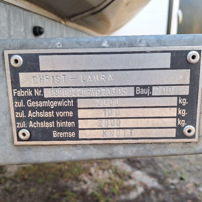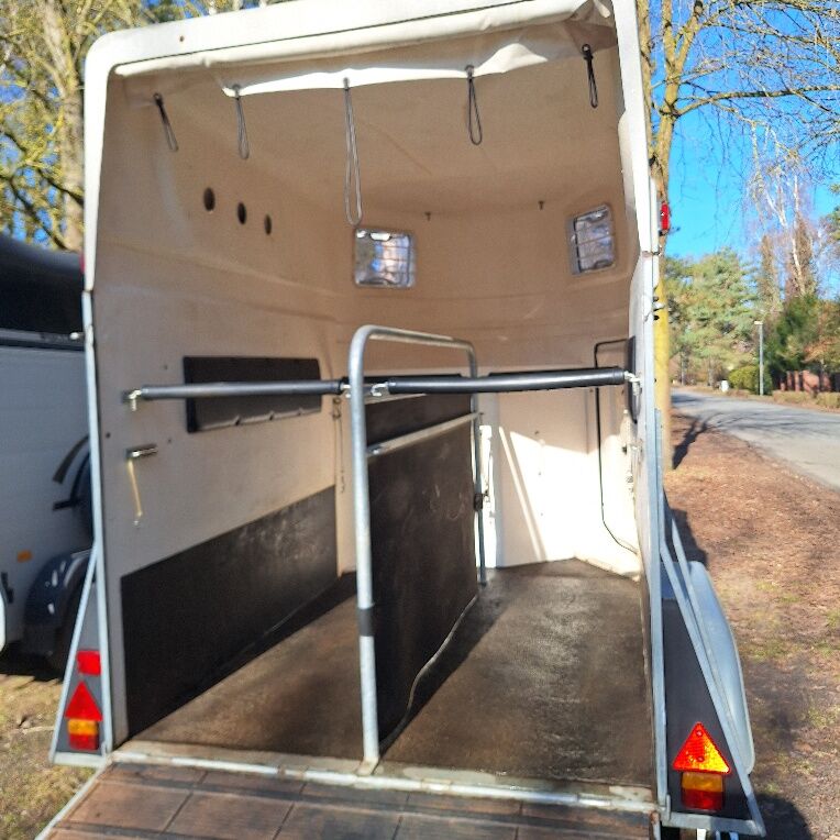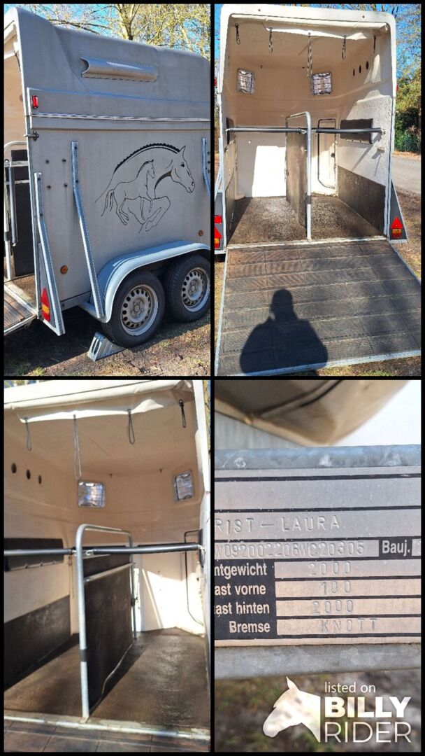 Przyczepa Chromy 2 konie pełna poli TÜV NOWA Bardzo dobrze utrzymana - Na sprzedaż moja bardzo dobrze utrzymana przyczepa do przewozu koni firmy Chromy - jak Böckmann ROK PRODUKCJI 03 2007 Dopuszczalna masa całkowita: 2000 kg TÜV nowy do 02/28 Nowe opony Stały kaptur poliestrowy Automatyczne koło kopiujące nowe Nowy zaczep kulowy 100% szczelności! Zamykane pomieszczenie na sprzęt oświetlone z lustrem, 2 uchwyty na uzdy i 2 uchwyty na siodła, uchwyt na plony Zamykane drzwi boczne Ochrona stopnia Wyściółka boczna Haki na siatkę na siano wewnątrz i 2 miski na paszę 4x regulowane drążki z funkcją antypaniczną 2 duże okna boczne Klapa tylna z nowymi sprężynami gazowymi Roleta plandekowa 4 zaczepy Gumowa podłoga przyklejona i uszczelniona Guma na klapie załadunkowej i zintegrowane paski stopni Ścianka działowa z PVC Oświetlenie wewnętrzne Specjalne wykończenie farbą z drobnym brokatem W zestawie osłona dyszla W zestawie immobiliser W zestawie ocynkowane kliny pod koła Wymiary wewnętrzne: Szer: 1,64 m, dł.: 2,27 m bez przyczepy, wys: 2,20 m dlatego nadaje się dla dużych koni.