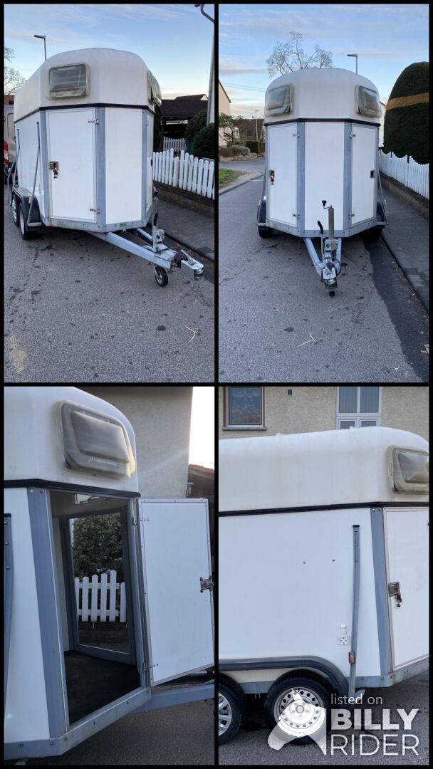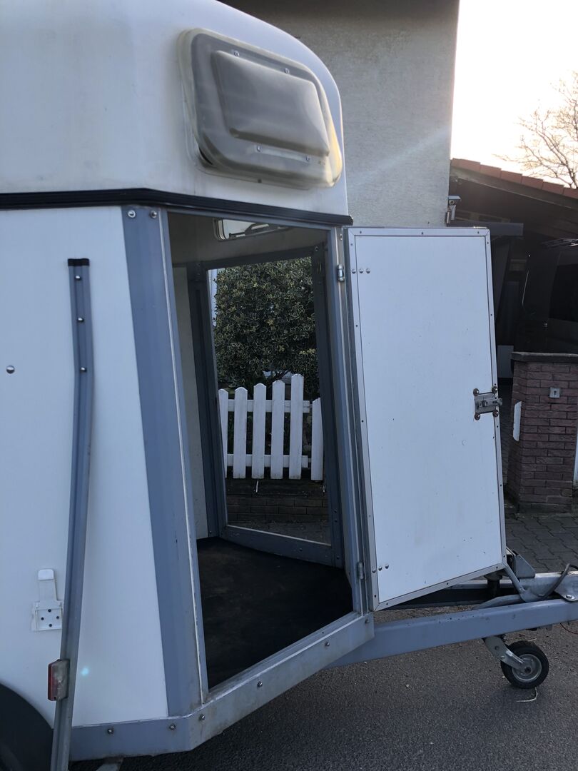 Przyczepa do przewozu 2 koni z odchylaną przegrodą.