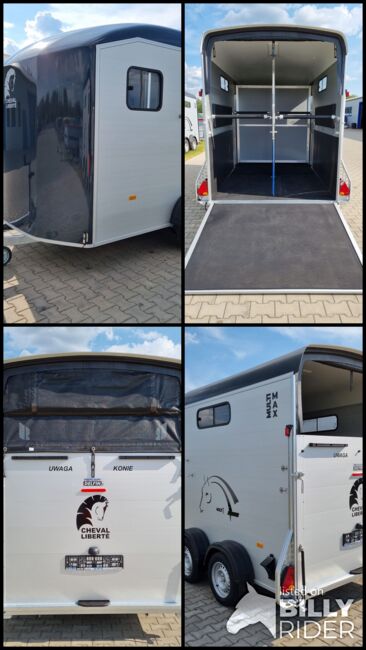 Przyczepa do przewozu koni Multimax Liberté z dużą siodlarnią i modułową konfiguracją - Podwójna przyczepa do przewozu koni z aluminiową ramą, bardzo szeroką siodlarnią, przegubową przegrodą centralną, zawieszeniem Pullman II i wzmocnionym poliestrowym dachem. Idealna do wygodnego, bezpiecznego i praktycznego transportu na dowolną odległość.