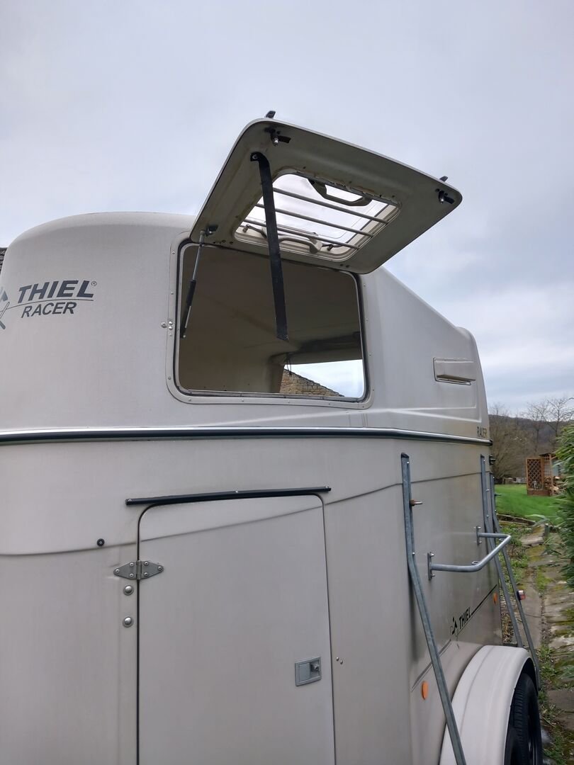 Przyczepa do przewozu koni Thiel Racer z pełnego polietylenu - Sprzedaję moją przyczepę Poly na 2 konie zbudowaną w 2001 r. Jest w dobrym stanie i obecnie ma 2-letni MOT, ze specjalnym wyposażeniem: wysuwanym uchwytem na siodło i oknem na zawiasach.