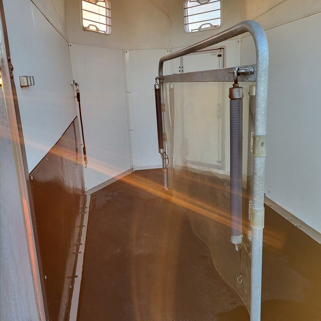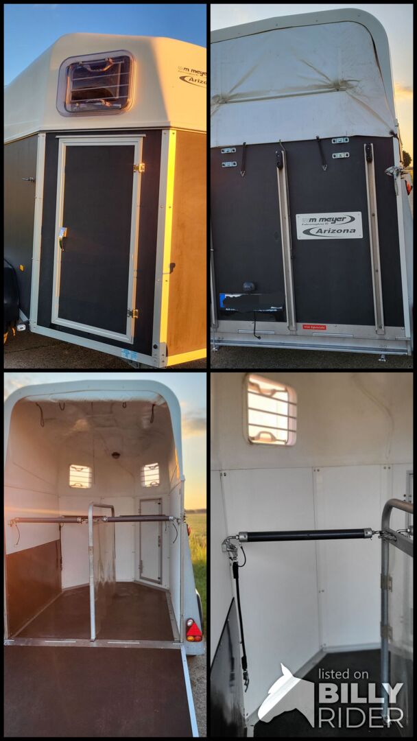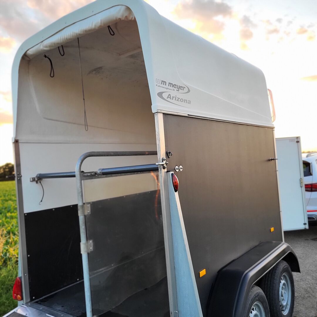 Przyczepa do przewozu koni Wm-meyer Arizona - Na sprzedaż dobrze utrzymana przyczepa do przewozu koni z pierwszej ręki. Pierwsza rejestracja 04/2014 Wymiary wewnętrzne: 3 050 x 1 660 x 2 300 mm Dopuszczalna masa całkowita: 2000 kg Przyczepa hamowana z automatycznym rewersem Sprzęg kulowy Niemieckie gumowe osie sprężynowe, ocynkowane podwozie kompaktowe wm-meyer Podwójna rama wm-meyer Wzmocnione koło kopiujące, składane, centrowane Chroniona listwa oświetleniowa Oświetlenie 12 V ze światłami cofania i tylnym światłem przeciwmgielnym 13-stykowa wtyczka Odporne na uderzenia błotniki z tworzywa sztucznego Wysokiej jakości opony 13" 2 kliny pod koła 2 światła pozycyjne lewe i prawe Ściany wykonane z drewna, pokryte tworzywem sztucznym Daszek z poliestru Przyciemniane okno na zawiasach z prętami Roleta plandekowa Oświetlenie wewnętrzne Drzwi serwisowe z przodu po prawej stronie w kierunku jazdy Rynna deszczowa nad drzwiami serwisowymi Tylna rampa z amortyzatorami gazowymi i gumą antypoślizgową Ścianka działowa z PVC (obrotowa i zdejmowana) Wyściełane drążki, podwieszane z przodu i z tyłu (z regulacją długości w trzech kierunkach) Awaryjne odblokowanie drążków z drążkiem zwalniającym Ucha do mocowania wewnątrz i na zewnątrz Okucia, zawias klapy, rama tylna, śruby, podkładki i nakrętki ze stali nierdzewnej