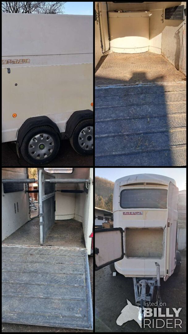 Przyczepa dwukonna Westfalia - Na sprzedaż z powodu nowego nabytku: Westfalia Jupiter white poly trailer dla dwóch koni Jasny kolor, przyjazne wnętrze, więc moje zwierzęta bardzo łatwo weszły. Bardzo płynnie działający i wierny torowi, oryginalny układ jezdny Westfalia Solidna ścianka działowa, całkowicie zdejmowana lub odchylana Wyściółka boczna (również na ściance działowej) i wyściełane pręty z przodu i z tyłu Pomieszczenie gospodarcze z dodatkowym dostępem z przodu, drzwi serwisowe na całej wysokości z przodu po lewej stronie Gumowa podłoga sklejona z konstrukcją, rampa wejściowa z gumą i paskami bieżnika odnowione: podłoga (kompletna), sprzęgło D, linka bezpieczeństwa i opony 2020, amortyzatory i linka hamulca 2023. EZ 08/2001