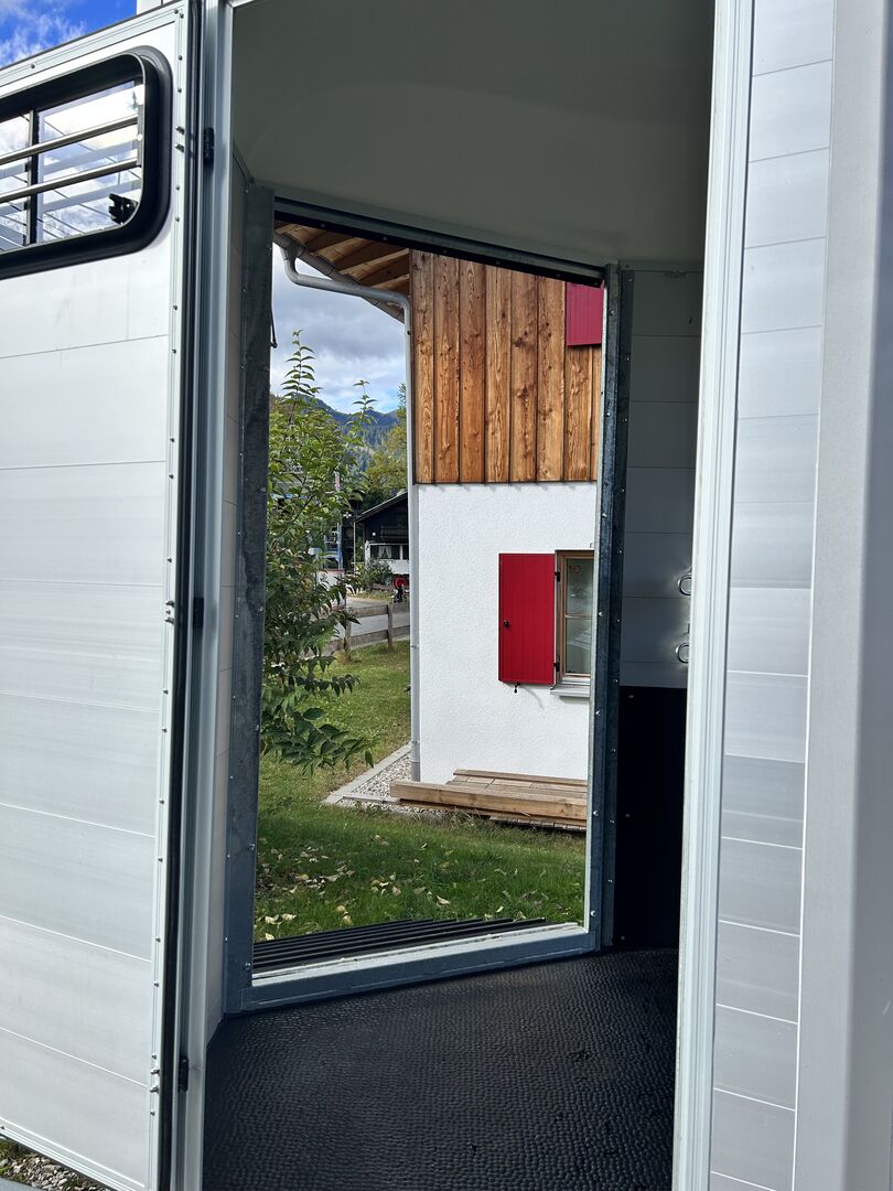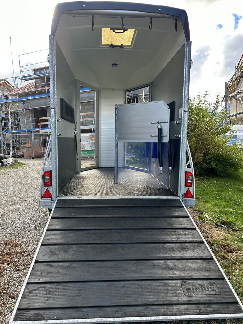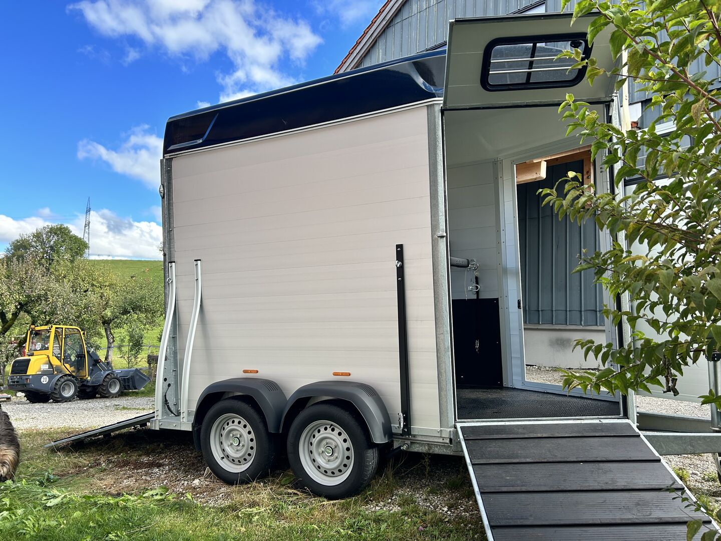 Przyczepy do przewozu koni na sprzedaż - Stan bardzo dobry. Przejechane tylko ok. 100 km. Odpowiedni dla dużych/ciężkich koni (wysokość 2,5 m, waga całkowita 2500 kg). Aluminiowa podłoga warstwowa, uszczelniona gumowa podłoga z tkaniny, kombinacja rampa/drzwi, gumowe spodnie i stopnie na rampie, FRONTAUSSTIEG, aluminiowe ściany, centralnie podzielona przegroda, bardzo wysokie drzwi wejściowe, przesuwane okna po bokach z kratami, regulowane drążki, ergonomiczne wyściełane pręty na piersi, Niebieski dach poliestrowy z otwieranym otworem wentylacyjnym, Oświetlenie wewnętrzne, Roleta plandekowa, Designerskie błotniki, Osie Alko, Ocynkowana ogniowo rama ze spawanymi belkami wzdłużnymi i poprzecznymi, Koła 15'', Automatyczne koło kopiujące, Osłony stopni na ścianach bocznych, Osłona nadwozia, Urządzenie najazdowe z automatycznym rewersem, Homologacja 100km/h