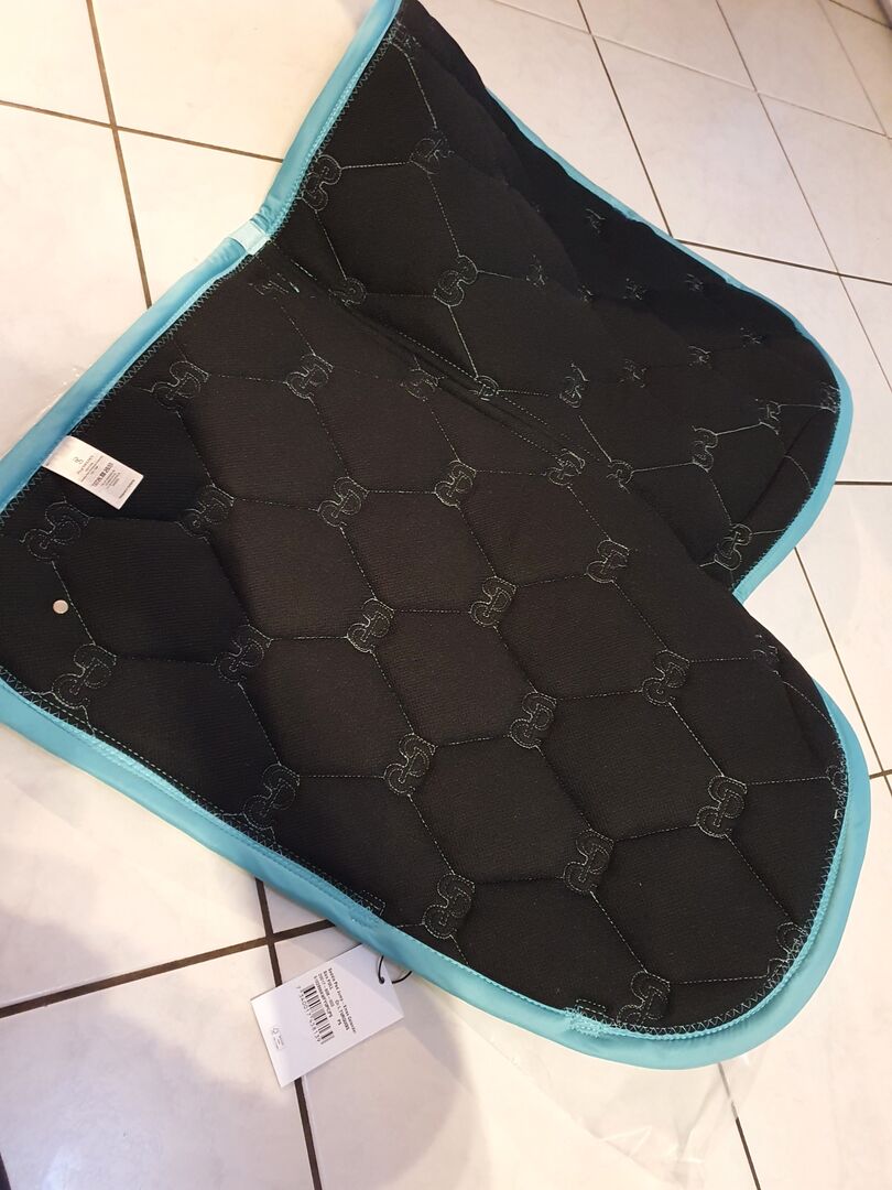 PS of Sweden Podkładka pod siodło do skoków - Sprzedaję nieużywaną podkładkę pod siodło skokowe w kolorze jasnego turkusu, ponieważ w zasadzie nie używam już siodła skokowego i w związku z tym nie muszę zaopatrywać się w tak dużą ilość podkładek. Ma jasno turkusową, gładką górną tkaninę, obramowanie w ciemniejszym turkusie i ładną białą obwódkę z ozdobnymi perełkami pomiędzy nimi. Spodnia strona jest czarna. Zamiast zwykłych górnych podkładek pod siodło, ta podkładka ma z przodu koralik, który utrzymuje podkładkę w miejscu.