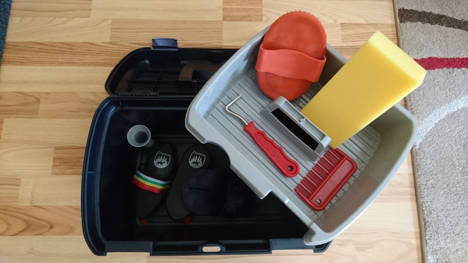 zestaw pielęgnacyjny: Skrobaczka do kopyt mała, nowa Grzebień do grzywy mały, nowy Krawężnik gumowy czerwony mały, nowy Szczotka do kart z Loesdau, jak nowa Szczotka do korzeni lub szczotka do grzywy Loesdau, nowa Grzebień do masażu curry z drobnymi wypustkami navy, nowy Gąbka, nowa Torebka ziołowych smakołyków