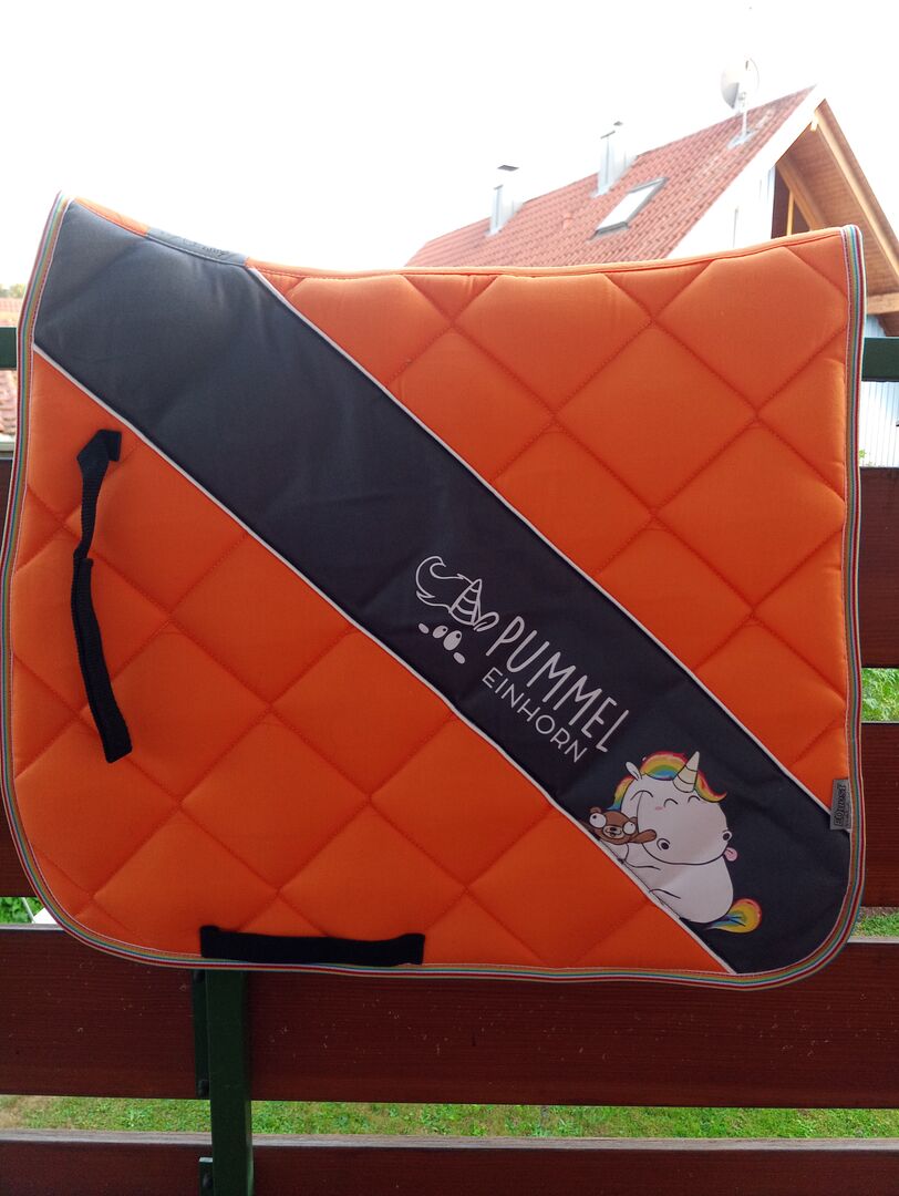Pummeleinhorn - Podkładka pod siodło ujeżdżeniowe z klockiem Pummeleinhorn, kolor pomarańczowy, nieużywana. Mam też pasującą halterę z linką.