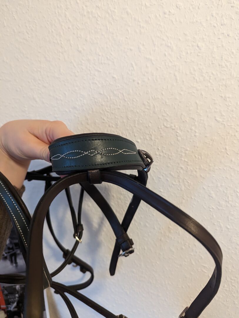 QHP Snaffle "Shiva - Sprzedaż pięknego snaffle z QHP. Snaffle jest zupełnie nowy i nigdy nie był na koniu. Kolor: ciemnozielony i brązowy z białymi kontrastowymi przeszyciami. Rozmiar: COB Cena pierwotna: 99,95 EUR