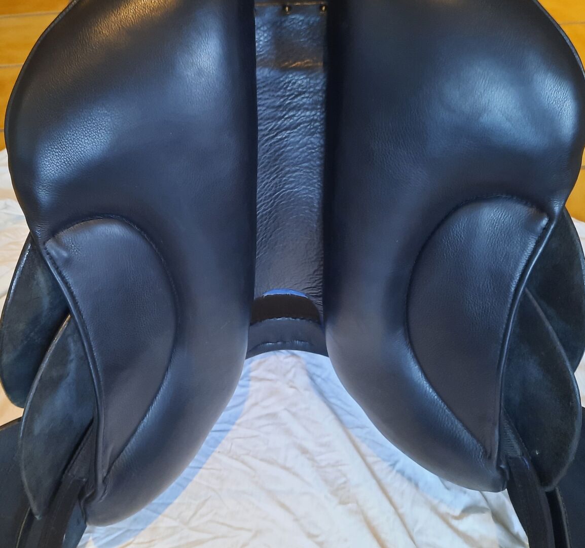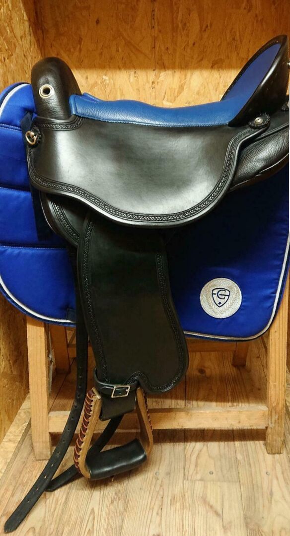 Drzewo siodła: drzewo Ultra-Flex z regulowaną szerokością wpustu Rozmiar siedziska: S3 Skóra siodła: naturalna gładka skóra czarna Skóra siedziska: Niebieska nappa Okucia: Srebrny Długość siodełka: ok. 53 cm Długość klapy siodełka: ok. 31 cm Waga: ok. 8,5 kg Zawiera błotnik i strzemiona z surowej skóry