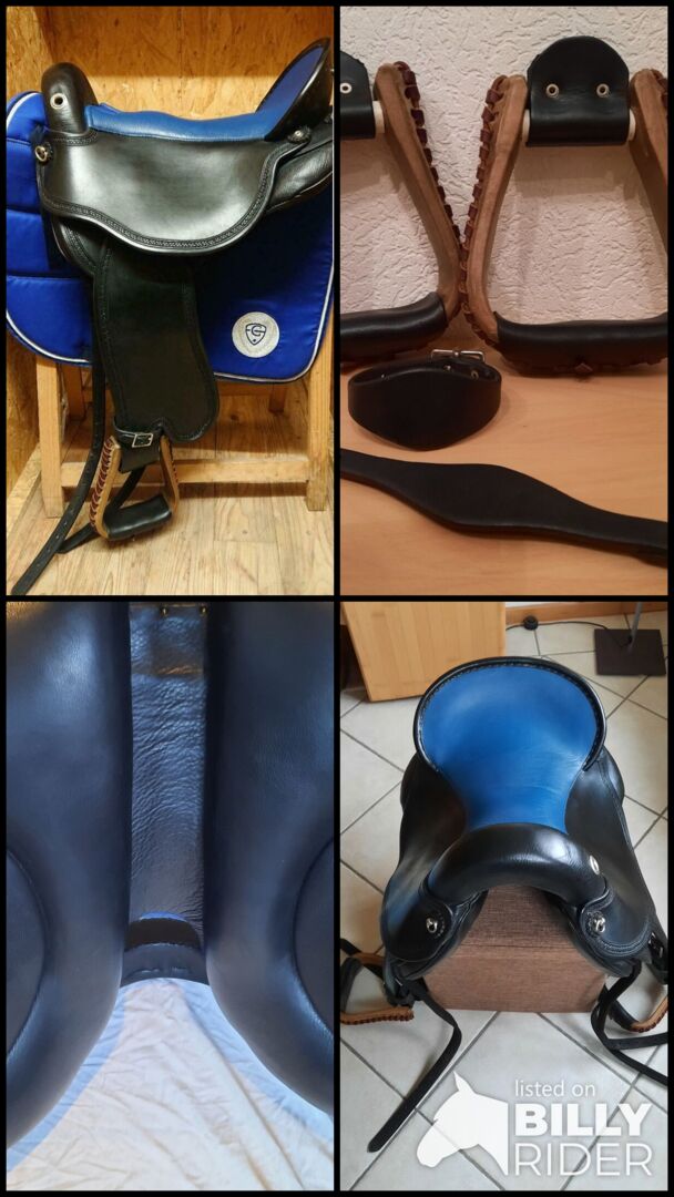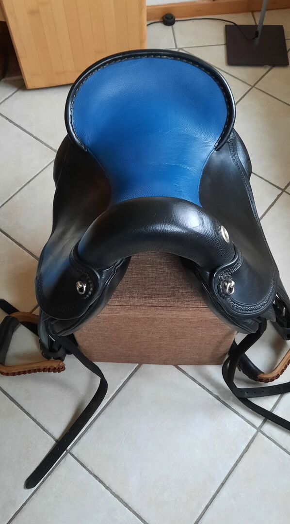 Quantum short & light od Deuber S3 - Sprzedaję moje siodło od Deuber und Partner / Quantum short & light S3 w kolorze czarnym z niebieskim siedziskiem - naprawdę przyciąga wzrok. Rozmiar siedziska S3 wynosi około 46 cm. Siodło ma 5 lat i jest w idealnym stanie, ponieważ było bardzo mało używane. Z oryginalnymi strzemionami z surowej skóry od Deuber and Partner Dostępny jest certyfikat siodła i nadal obowiązuje roczna gwarancja na drzewo siodła. Siodło jest elastycznie regulowane i umożliwia dobre rozłożenie nacisku. Płyta wpustowa jest regulowana bezstopniowo. Duże panele optymalnie rozkładają ciężar jeźdźca na grzbiecie konia. Oto specyfikacje producenta: