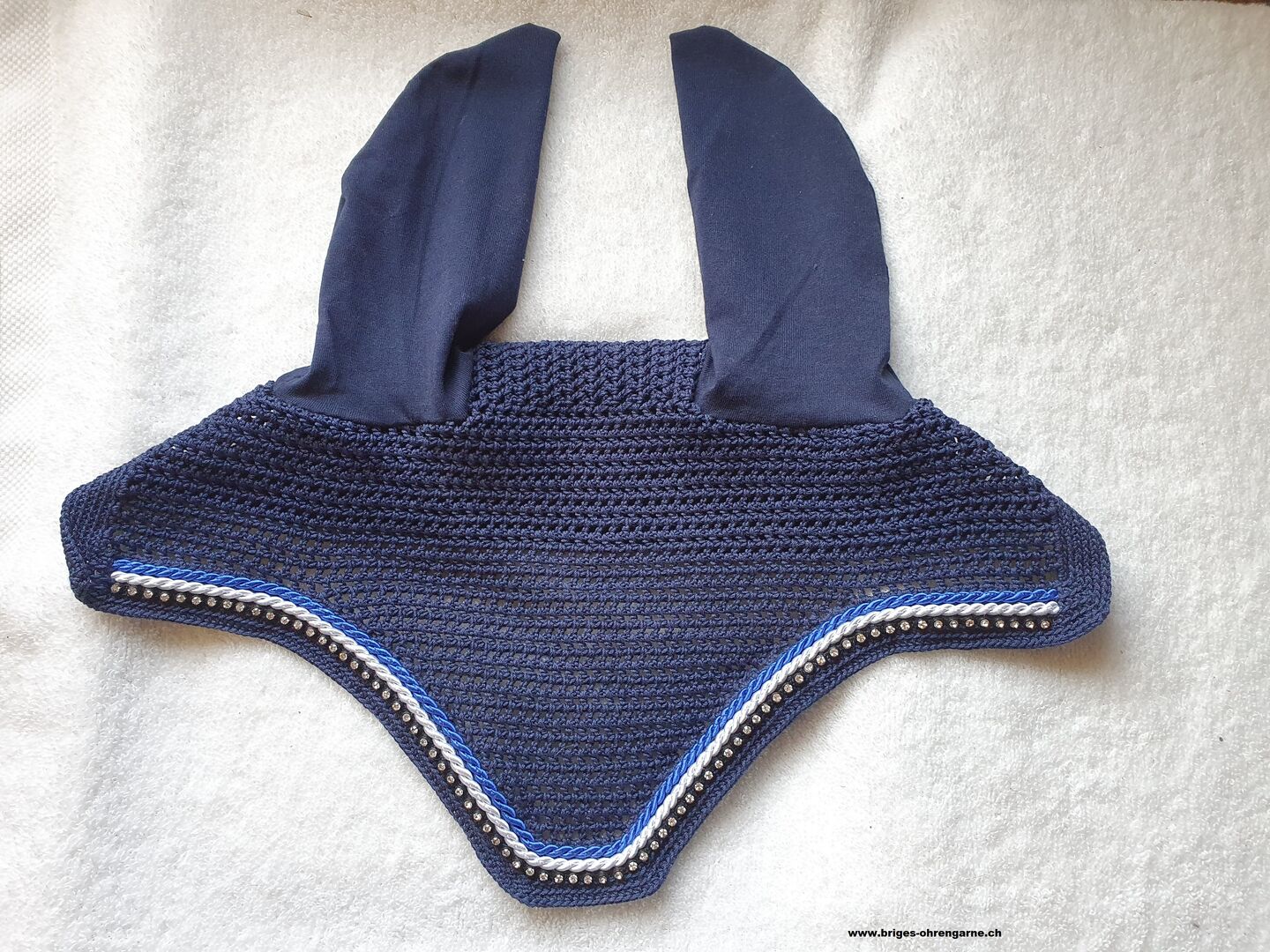 Ręcznie robiona włóczka do uszu - Sprzedam ręcznie robioną włóczkę do uszu w kolorze ciemnoniebieskim z dżetami i sznurkami, rozmiar koń