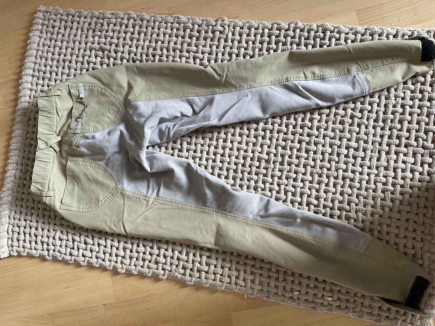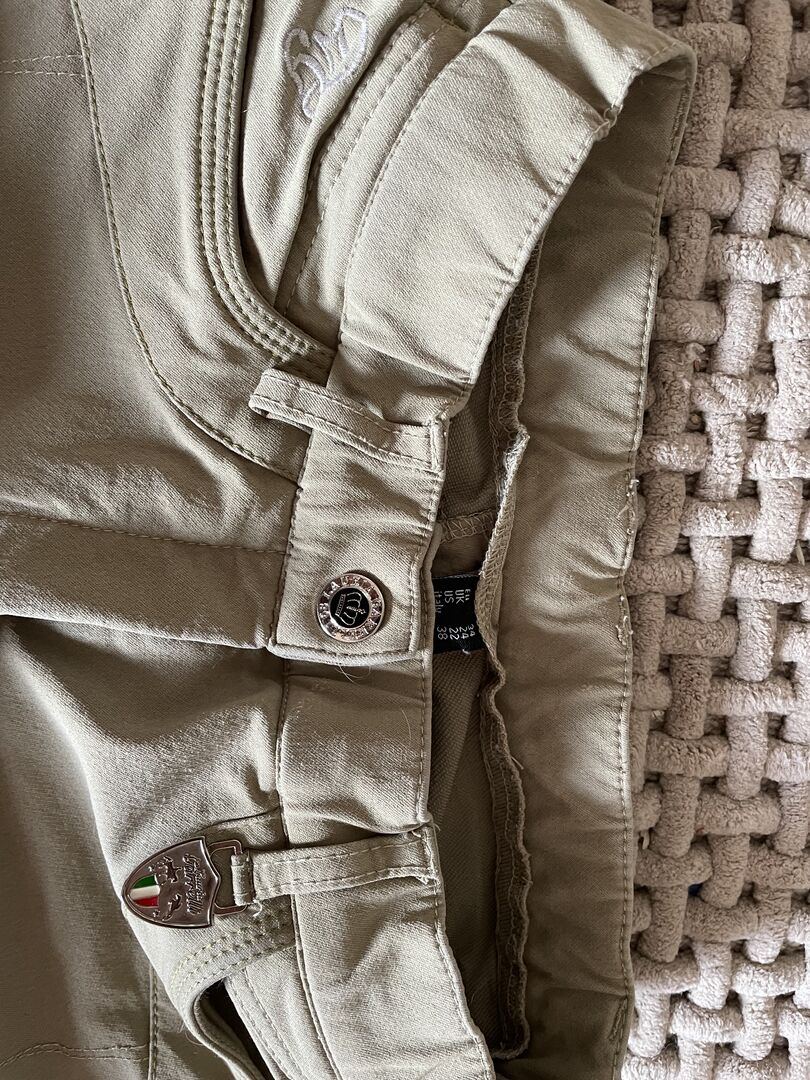 Sprzedam parę bryczesów Lauria Garrelli w kolorze beżowym, rozmiar 34 z pełnym skórzanym wykończeniem. Ponieważ jest to marka włoska, bryczesy są nieco mniejsze. Bryczesy były noszone tylko okazjonalnie i sprzedaję je tylko dlatego, że już na mnie nie pasują. Z tego względu na wykończeniu widoczne są jedynie niewielkie ślady zużycia. rzepy, zamek błyskawiczny, elastyczny pas i guzik działają bez zarzutu. Ponieważ jest to sprzedaż prywatna, gwarancja i zwrot są wykluczone. Można je również wcześniej przymierzyć.