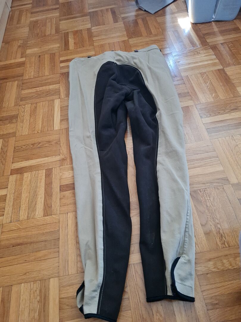 Beżowe bryczesy jeździeckie z ciemnobrązowymi skórzanymi wykończeniami. W rozmiarze 42.