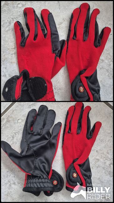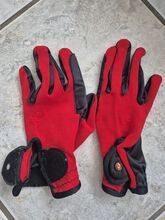 Rękawiczki jeździeckie HKM (czerwone) - Rękawiczki jeździeckie od HKM w kolorze czerwonym. Materiał jest lekko chropowaty w niektórych miejscach, ale nie powinno to stanowić problemu. Rozmiar stosunkowo mały. Dom wolny od zwierząt i dymu tytoniowego.