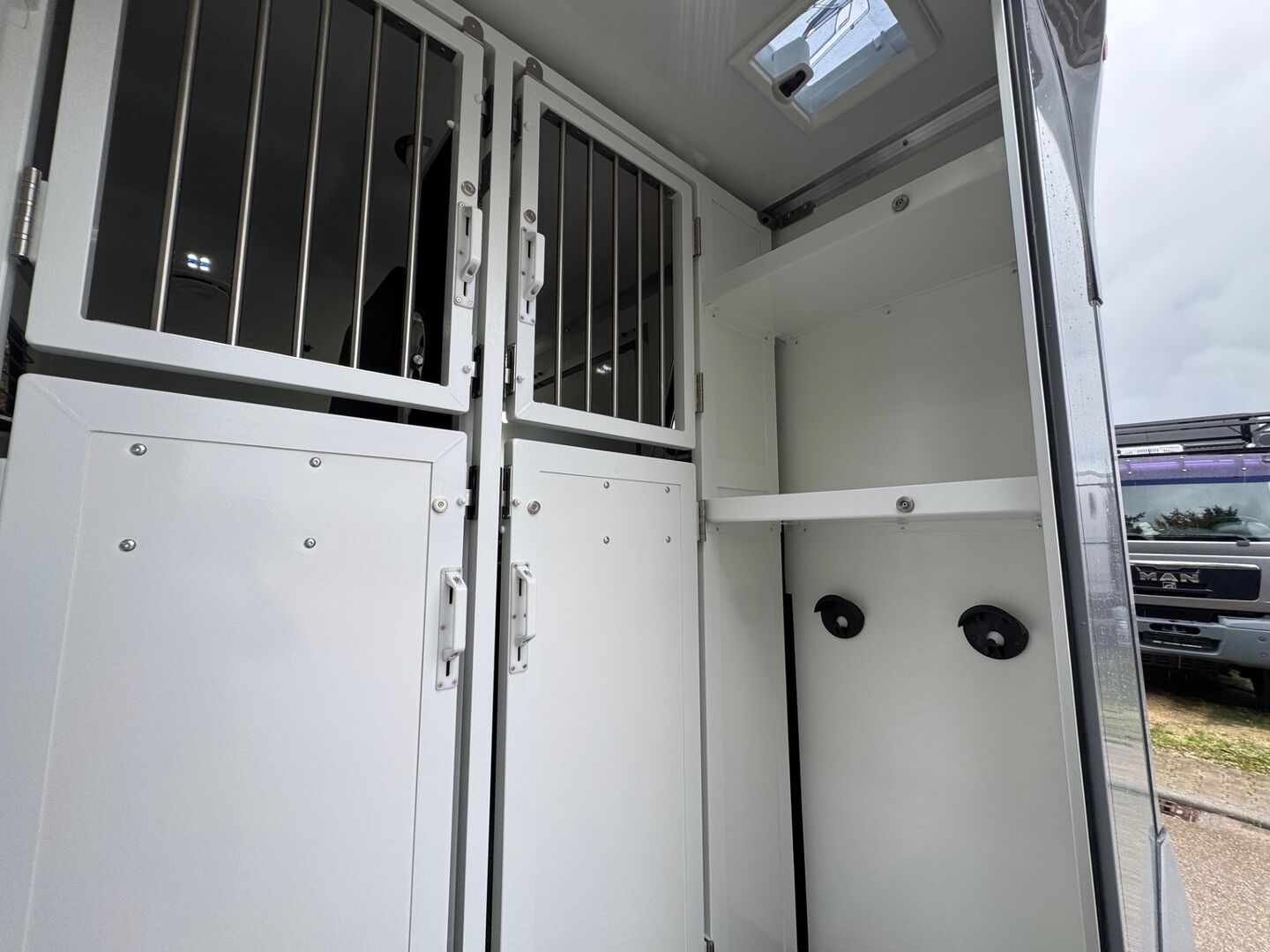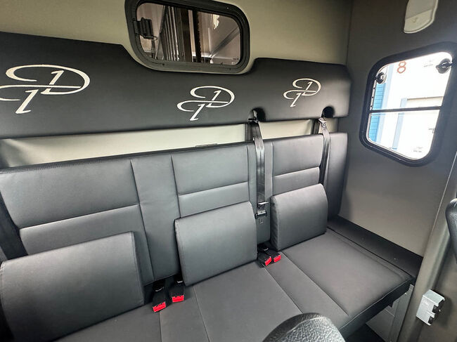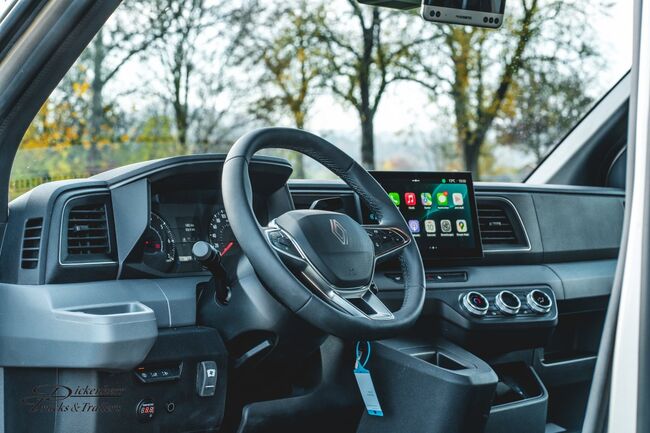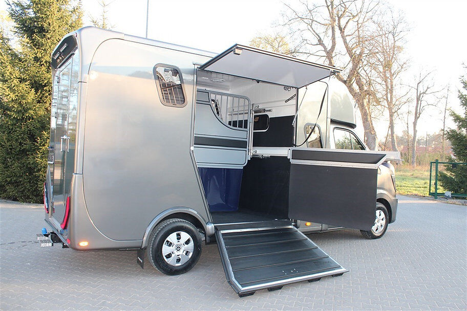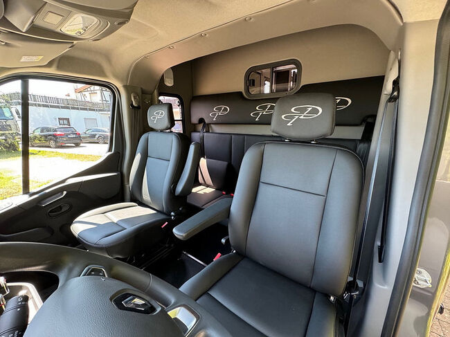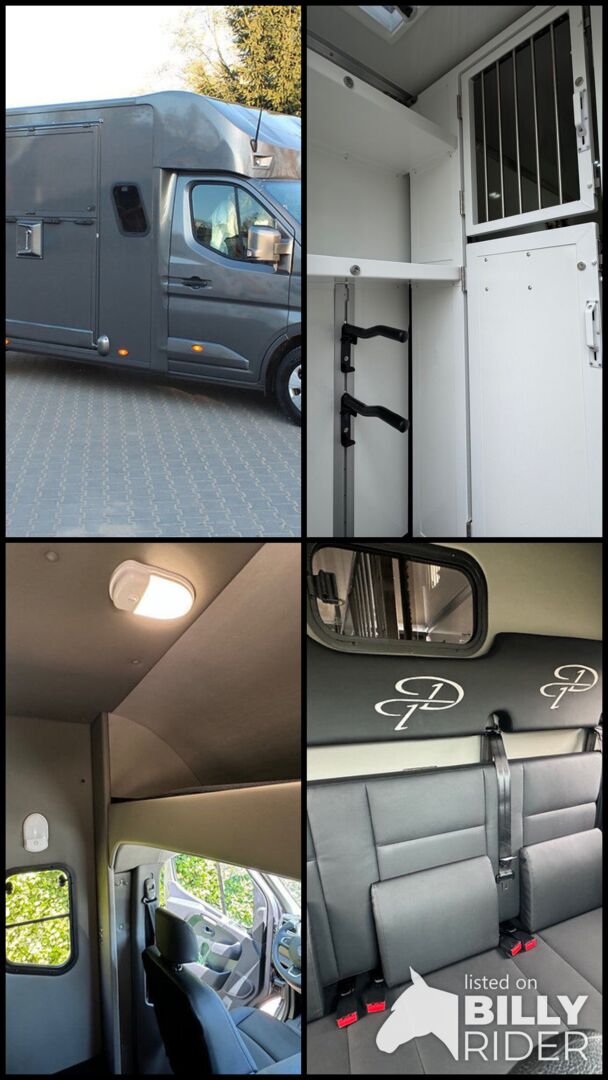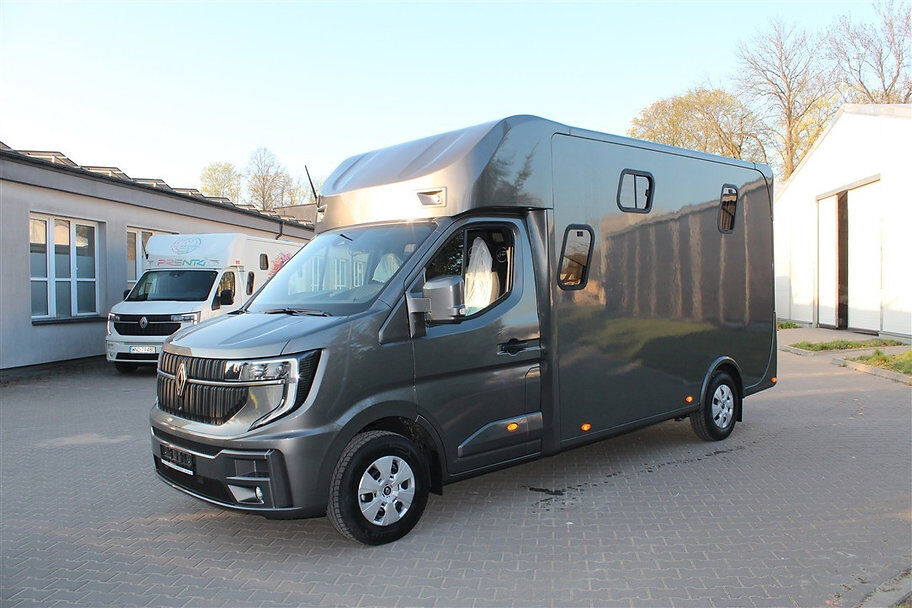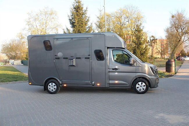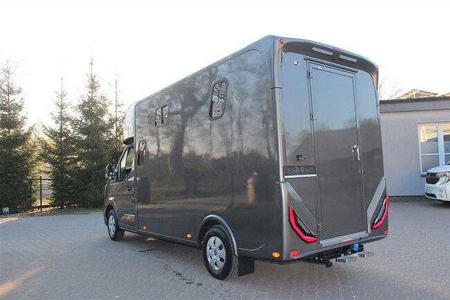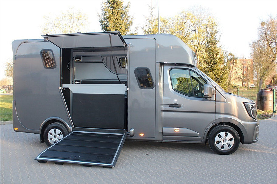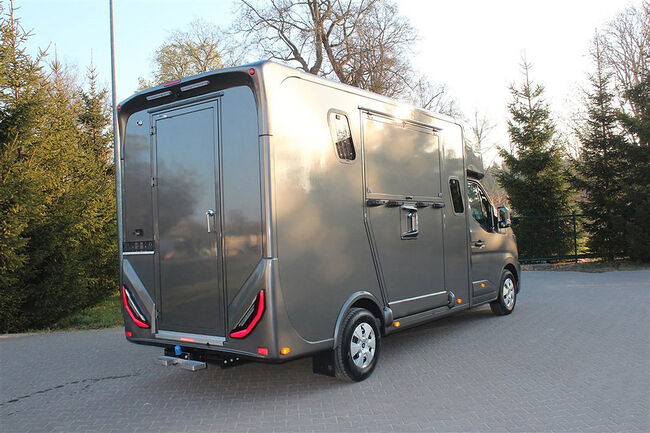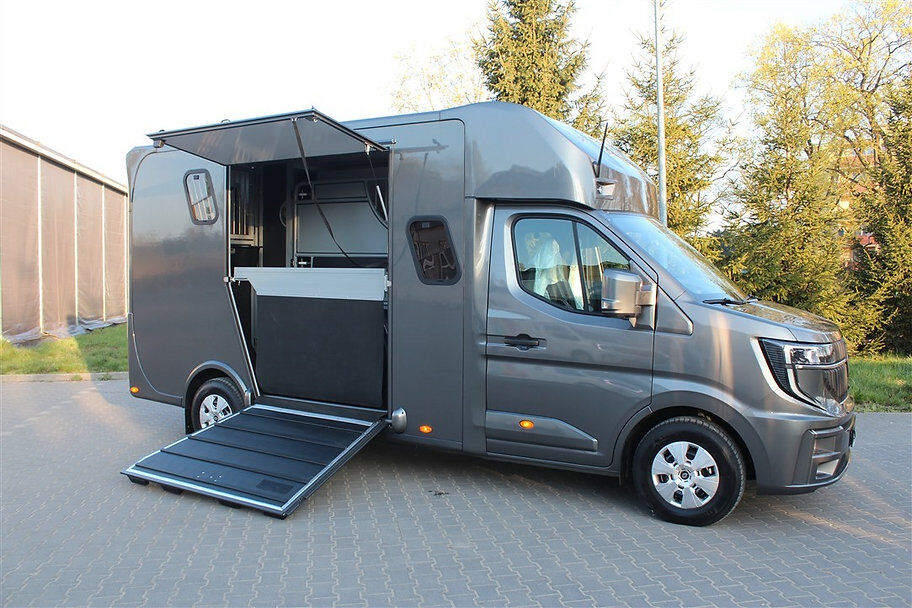 Nowy pojazd Dickenherr 2-Ride Team z 5 miejscami siedzącymi i 3 kojami Nowy Renault Master imponuje przede wszystkim całkowicie nową automatyczną skrzynią biegów, która zapewnia wyjątkowo płynną i przyjemną zmianę biegów. Wnętrze również zostało całkowicie przeprojektowane i jest imponujące. Nowe Renault Master jest wyposażone w nowy ekran do monitorowania obszaru dla koni i kamerę cofania, monitorowanie temperatury przedziału dla koni (z wyświetlaczem w kabinie kierowcy), 2 elektryczne wentylatory dachowe w przedziale dla koni. Pojazd jest wyposażony w 2,5-tonowy zaczep do przyczepy. W razie potrzeby można go wzmocnić do 3,5 tony. 2. rząd siedzeń w nadwoziu z 3 dodatkowymi zarejestrowanymi siedzeniami. Kanapę można łatwo przekształcić w łóżko piętrowe