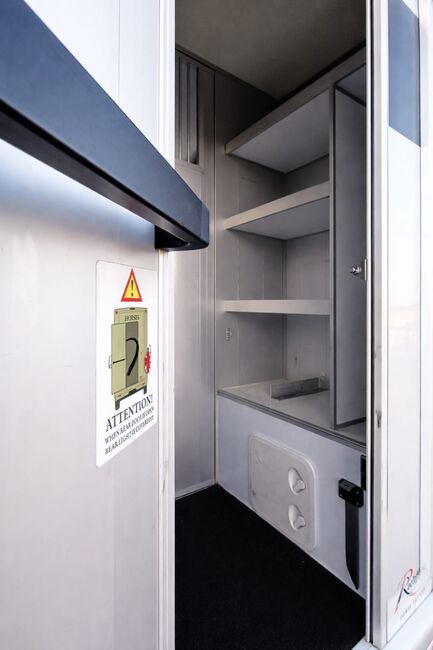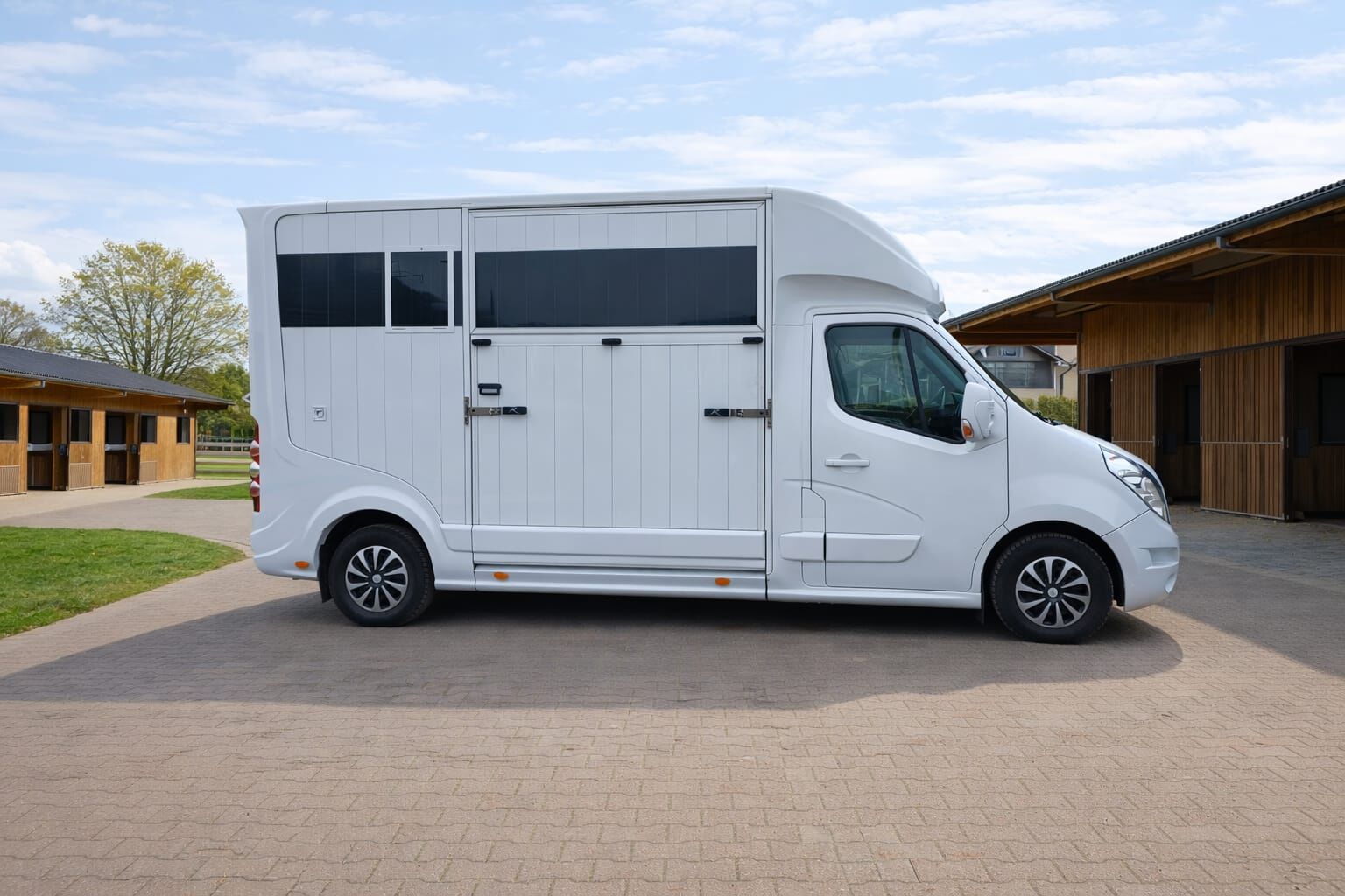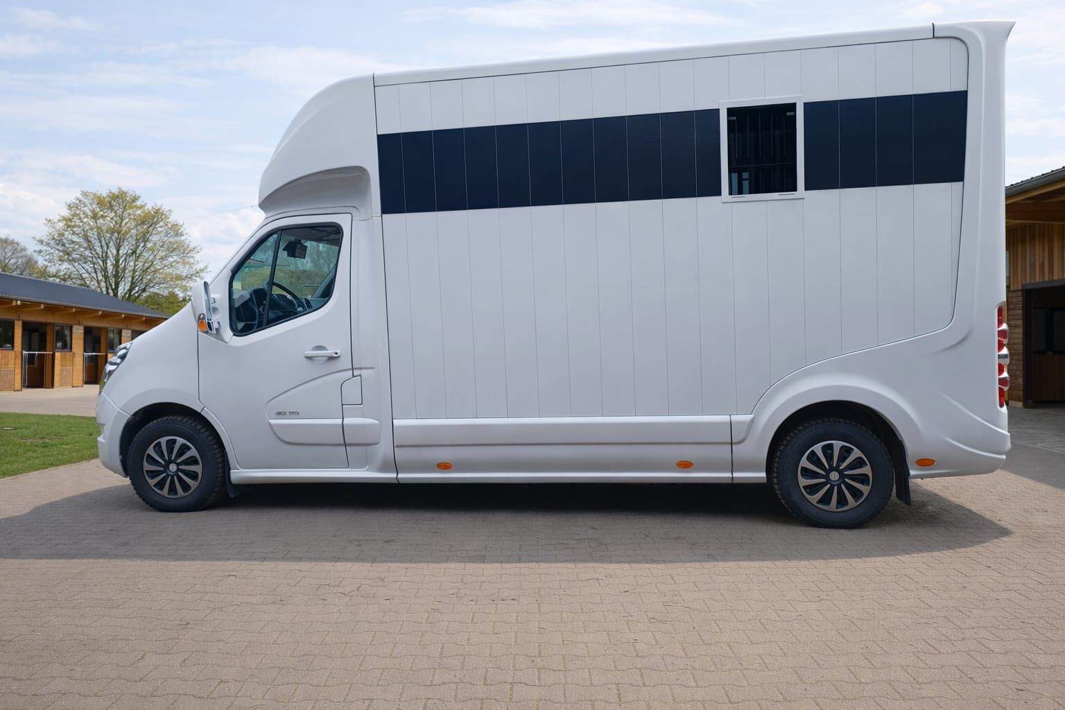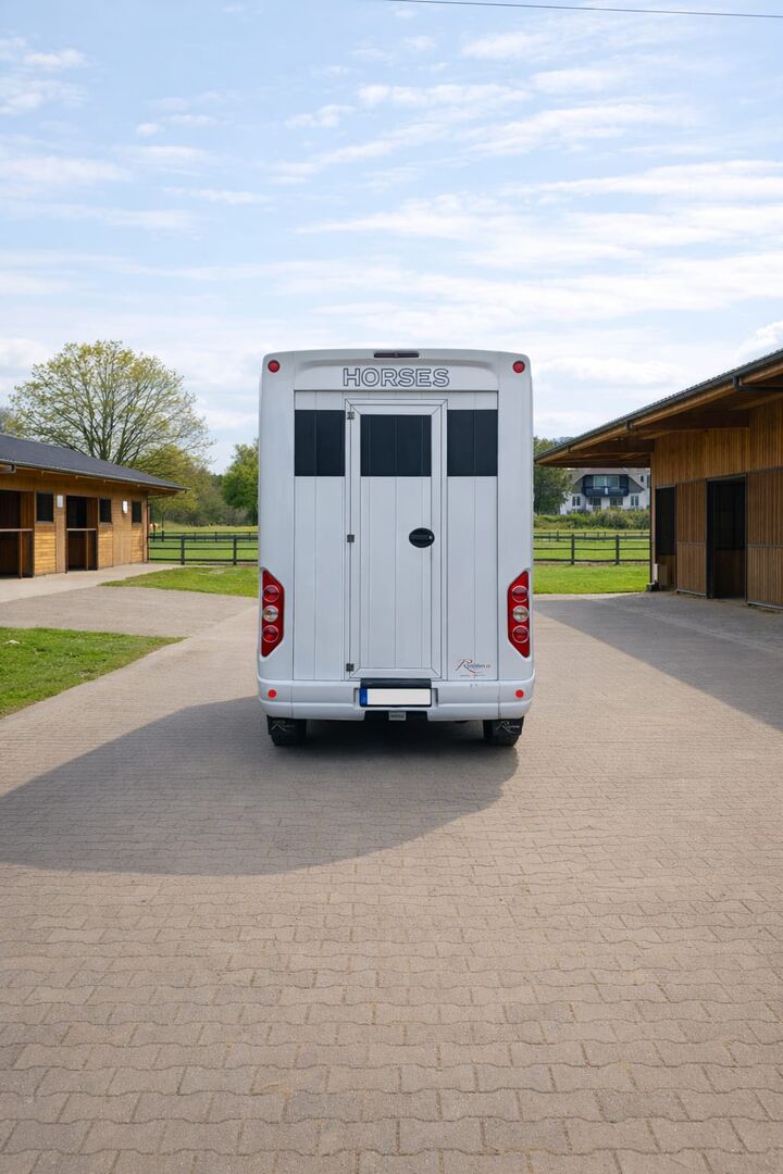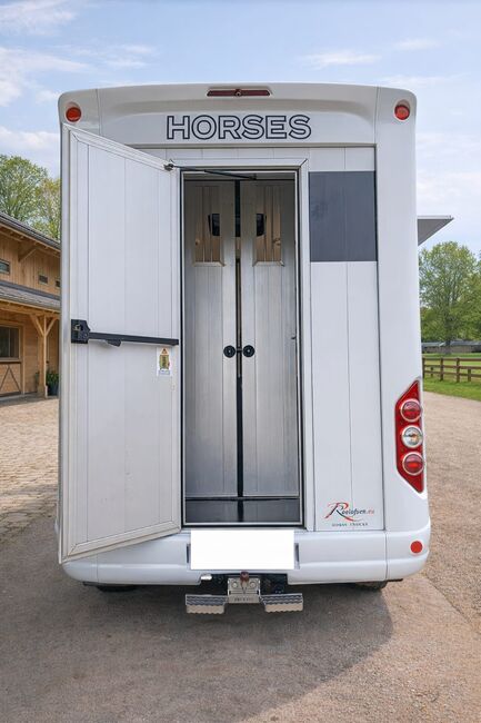 Wyposażenie w skrócie: - Manualna skrzynia biegów, kierownica z regulacją wysokości - Kamera cofania ułatwiająca manewrowanie - Dodatkowa kamera do monitorowania obszaru dla koni podczas jazdy - Niebieskie światło w kabinie kierowcy i w obszarze dla koni - 2 wywietrzniki dachowe + okno dachowe i 2 okna z kratkami w przedziale dla koni - Gumowe panele na podłodze rampy i na ścianach - Przesuwana ścianka działowa z matą PCV (można ją dosunąć do samej ściany) - Wersja dla ogierów, drzwi z kratkami między strefą dla koni a pomieszczeniem na sprzęt - Boczna rampa po prawej stronie dla łatwego i bezpiecznego załadunku - Duży schowek z tyłu z dużą ilością miejsca na sprzęt, w tym uchwyt na siodło i uzdy, z oddzielnym oświetleniem - Sprzęg przyczepy o udźwigu 2,5 tony - Wytrzymałe i sprawdzone nadwozie Roelofsen - Schowek nad kabiną z przesuwanymi drzwiami (możliwość załadunku z przedziału dla koni) - Zbiornik paliwa 80 litrów - Wymiary LxWxH w mm 6200x2100x3050