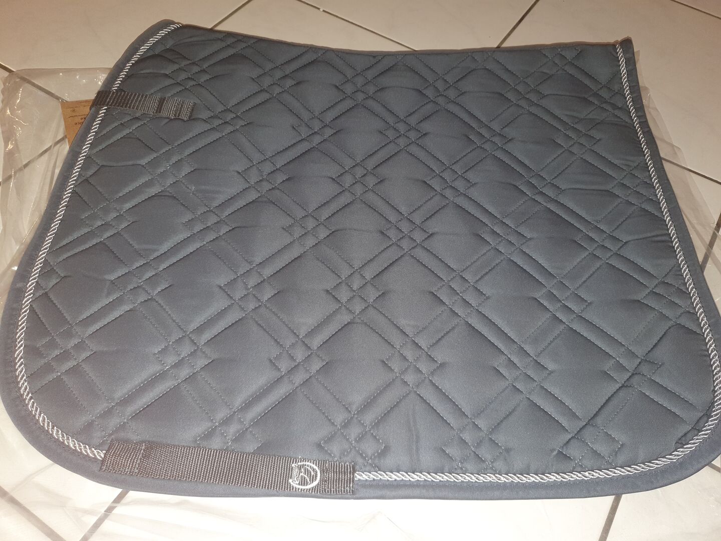 Oferuję do sprzedaży nową podkładkę pod siodło ujeżdżeniowe. Kolor jest ciemnoszary. Obramowanie jest w tym samym kolorze. Podkładka pod siodło ozdobiona jest dyskretnym jasnoszarym sznurkiem, a materiał jest ładnie pikowany.