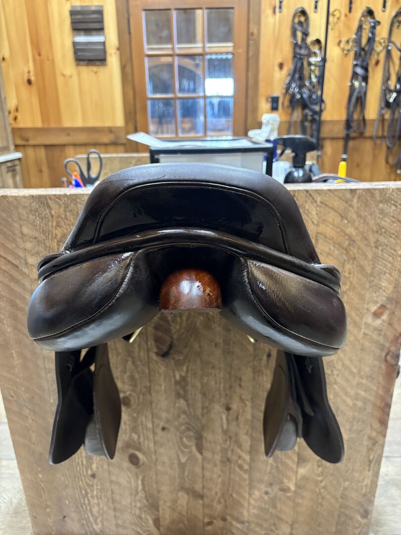 I purchased this custom saddle with buffalo leather in a dark chocolate brown. 17.5" Standard Centennial, twin flap; Rolls on velcro; Brown Remy Hide seat, roll cover, piping, cantle, and front & back facings; Brown Buffalo skirt and flaps; 12.5" flaps. This saddle is in perfect, like new condition but nicely broken in! Paid more than $7k new.