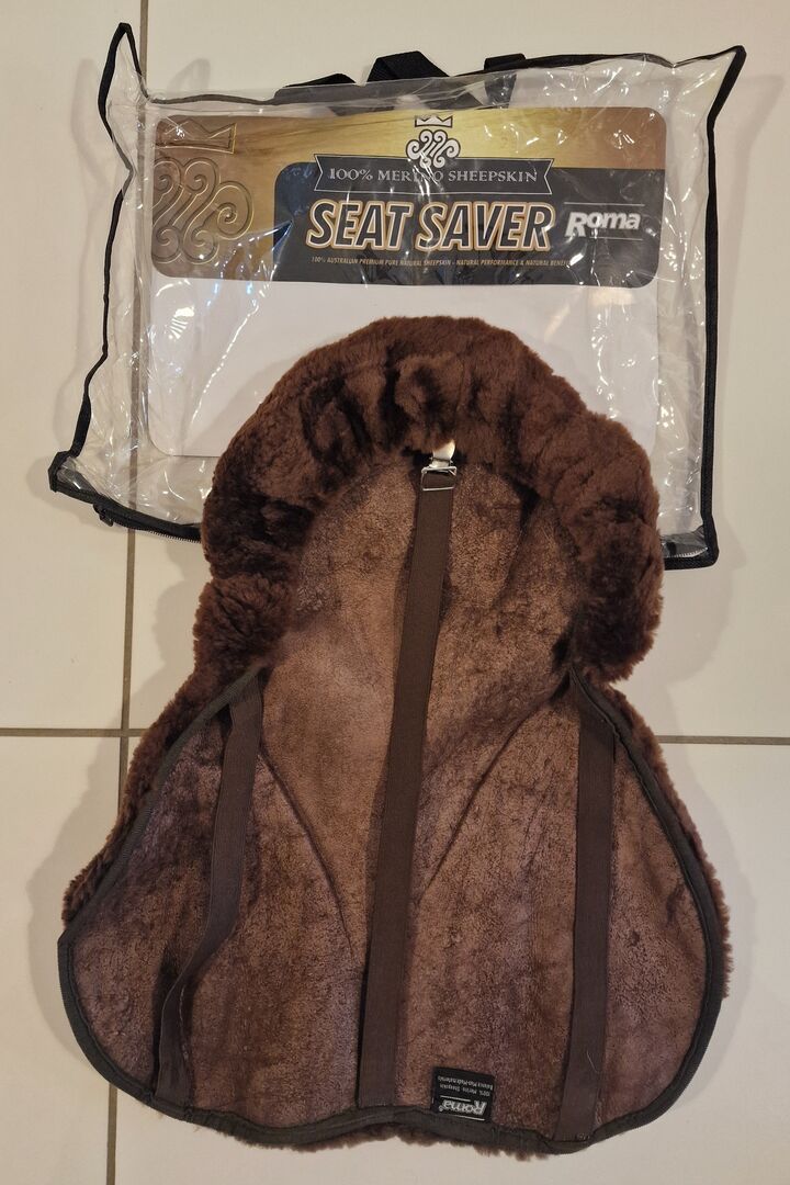 Roma 100% Merino Sheepskin Saddle Seat Saver - Chocolate. Hardly used. Made from 100% Merino sheepskin and designed to fit securely onto a saddle and is suitable for long horse rides. Elasticated straps are easy to use and keep the seat saver in place. The seat saver is machine washable at 30 degrees Celsius or on a cool wash.