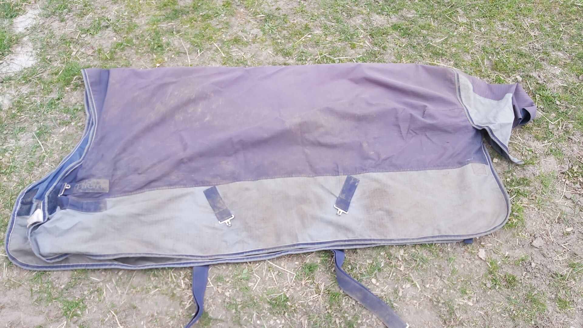 Rozmiar 135 Equitheme derka przeciwdeszczowa padokowa wysoka szyja - Używana derka przeciwdeszczowa firmy Equitheme w rozmiarze 135 z wysoką szyją