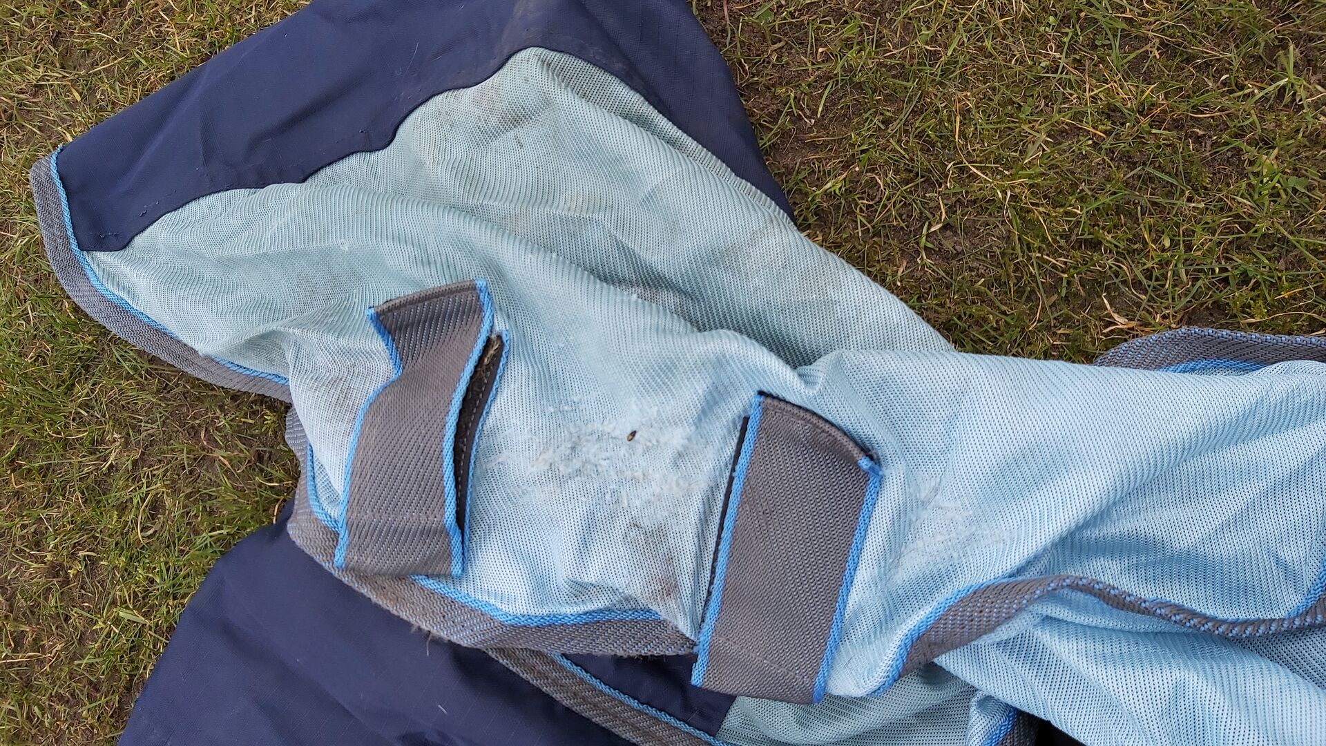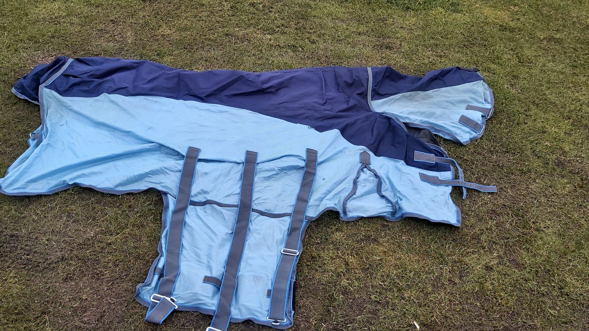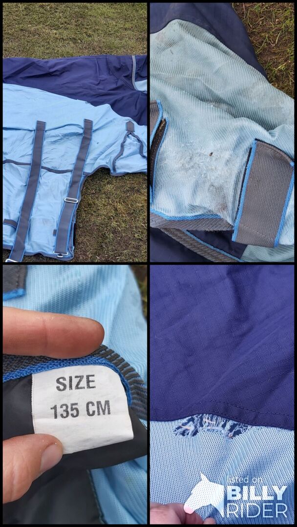 Rozmiar 135 Latający dywanik z częścią przeciwdeszczową + część szyjna - Nosiliśmy go w zeszłym roku, teraz jest na nas za mały. W tym sezonie mamy taki sam w 145. Część przeciwdeszczowa z tyłu jest idealna na mokre i ciepłe letnie dni, a część rozpinana na dole zapewnia przewiewność.