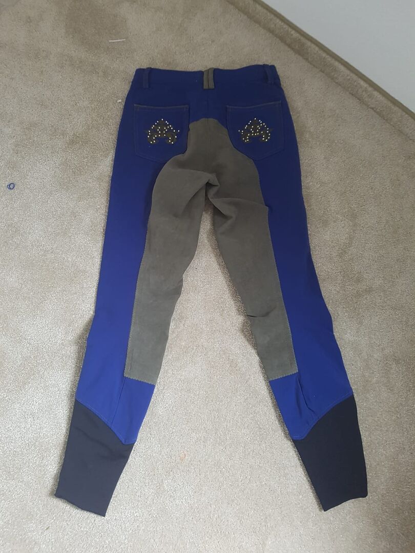 Rozmiar 170 Bryczesy młodzieżowe - Niebieskie bryczesy dziewczęce firmy Busse z jasnoszarymi kontrastowymi szwami i siedziskiem z pełnej skóry. Mankiety nogawek są elastyczne. Na kieszeniach spodni znajduje się dyskretny haft z kilkoma dżetami. Wygodna pozycja siedząca i duża swoboda ruchów. Niewielkie ślady zużycia.