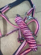 Różne akcesoria - Witam wszystkich, Sprzedaję różne akcesoria dla koni. Z jednej strony halter w kolorze różowym / różowym / fioletowym w rozmiarze pełnym z pasującą liną bez haków antypanicznych. Również fioletowy wiązany kantar z pasującą liną, która niestety nie jest zdejmowana. Następnie getry i buty na zadzie w pełnym rozmiarze oraz czerwone gogle do lonżowania i 8 błyszczących "gumek" na grzywę w kolorze różowym, które są bardziej odpowiednie do grubszych warkoczy, np. na pokazy. Ceny są tutaj również inne.